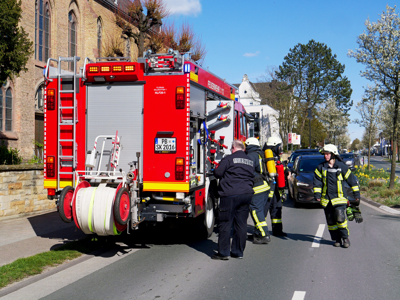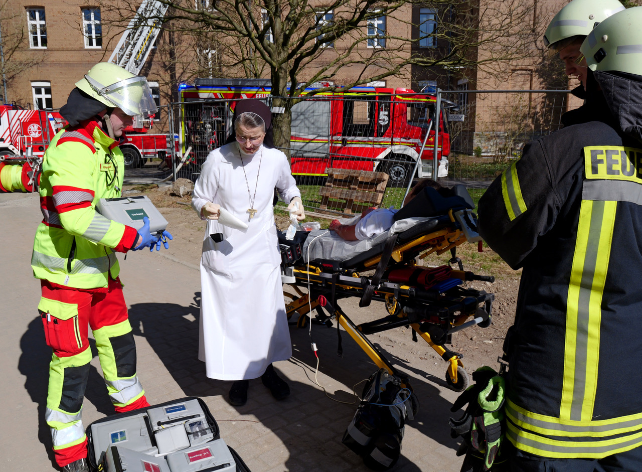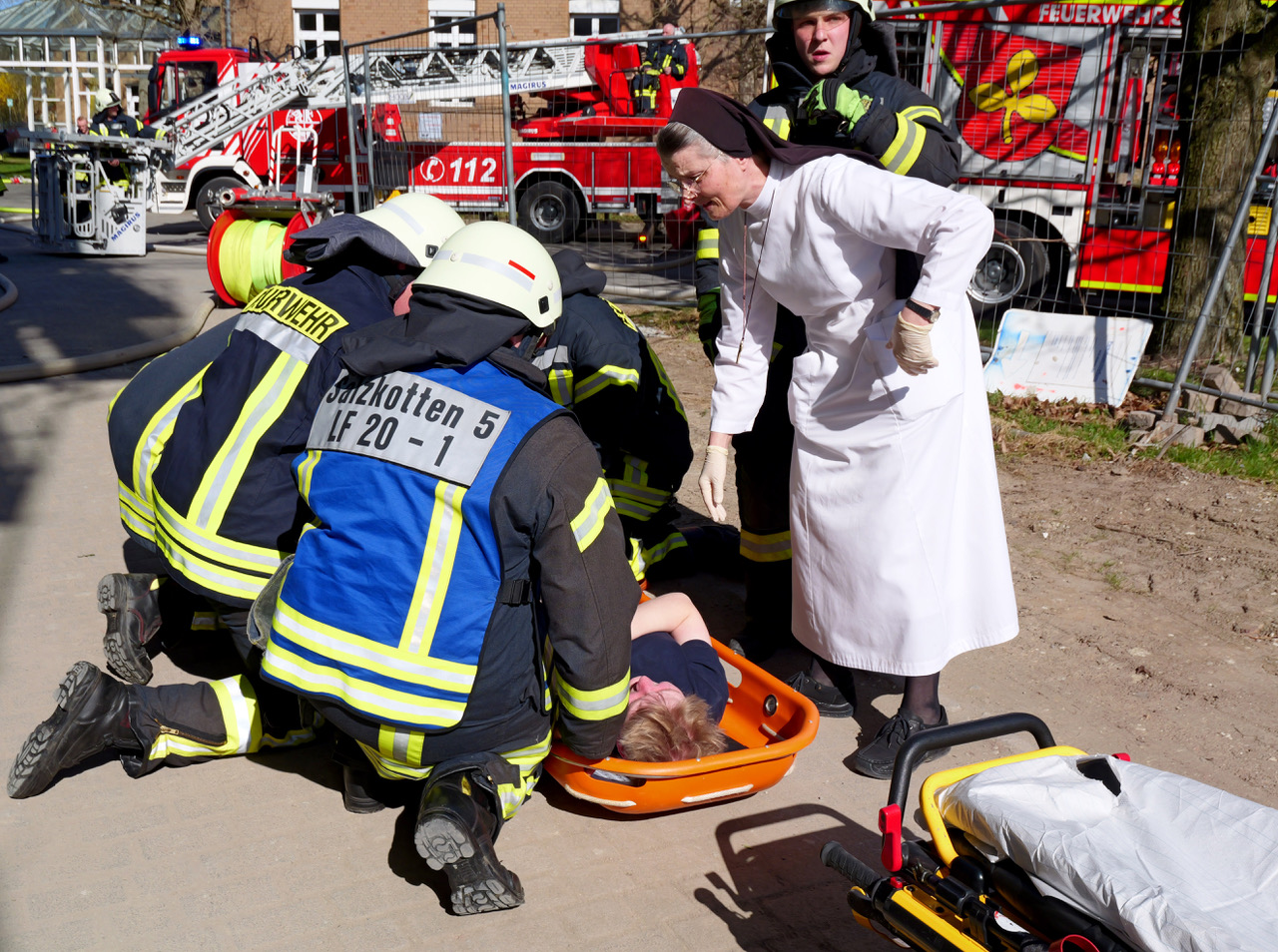 Weit über hundert Einsatzkräfte der Feuerwehr und des Deutschen Roten Kreuzes probten am Samstagnachmittag bei einer Einsatz- und Alarmübung die Menschenrettung bei einem größeren Brand im Mutterhaus der Kongregation der Franziskanerinnen an der Paderborner Straße in Salzkotten.