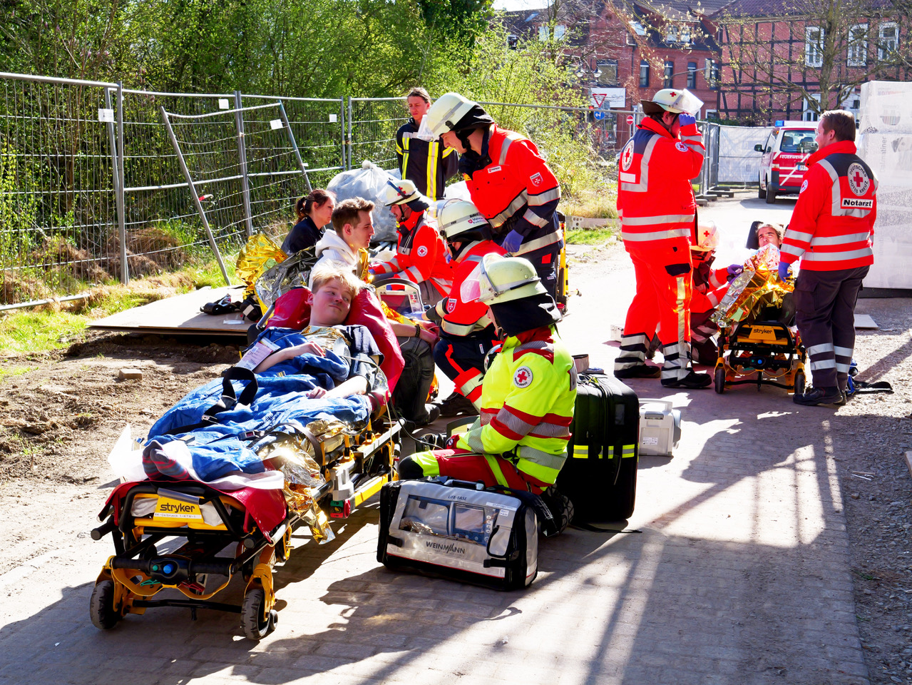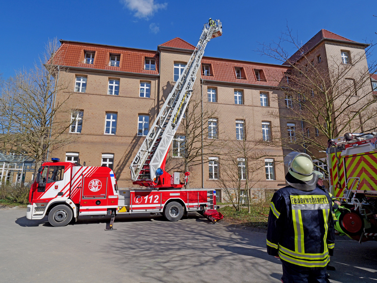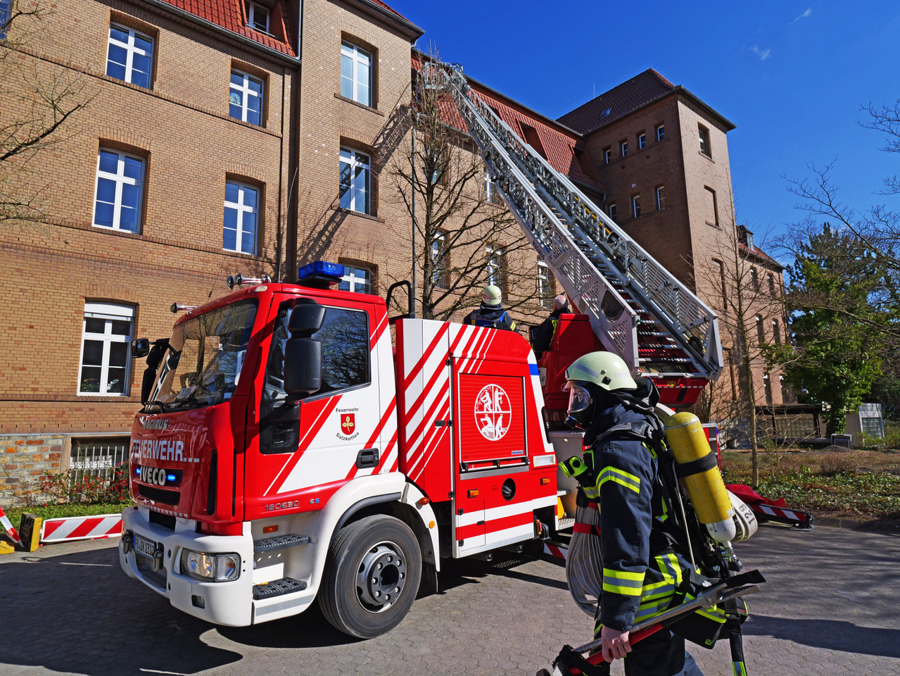 Weit über hundert Einsatzkräfte der Feuerwehr und des Deutschen Roten Kreuzes probten am Samstagnachmittag bei einer Einsatz- und Alarmübung die Menschenrettung bei einem größeren Brand im Mutterhaus der Kongregation der Franziskanerinnen an der Paderborner Straße in Salzkotten.