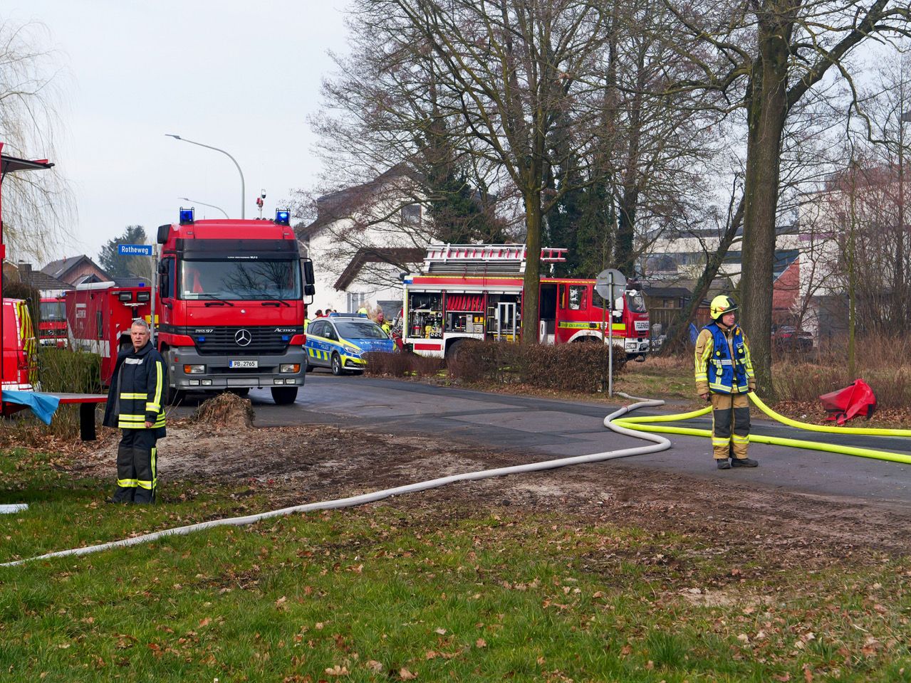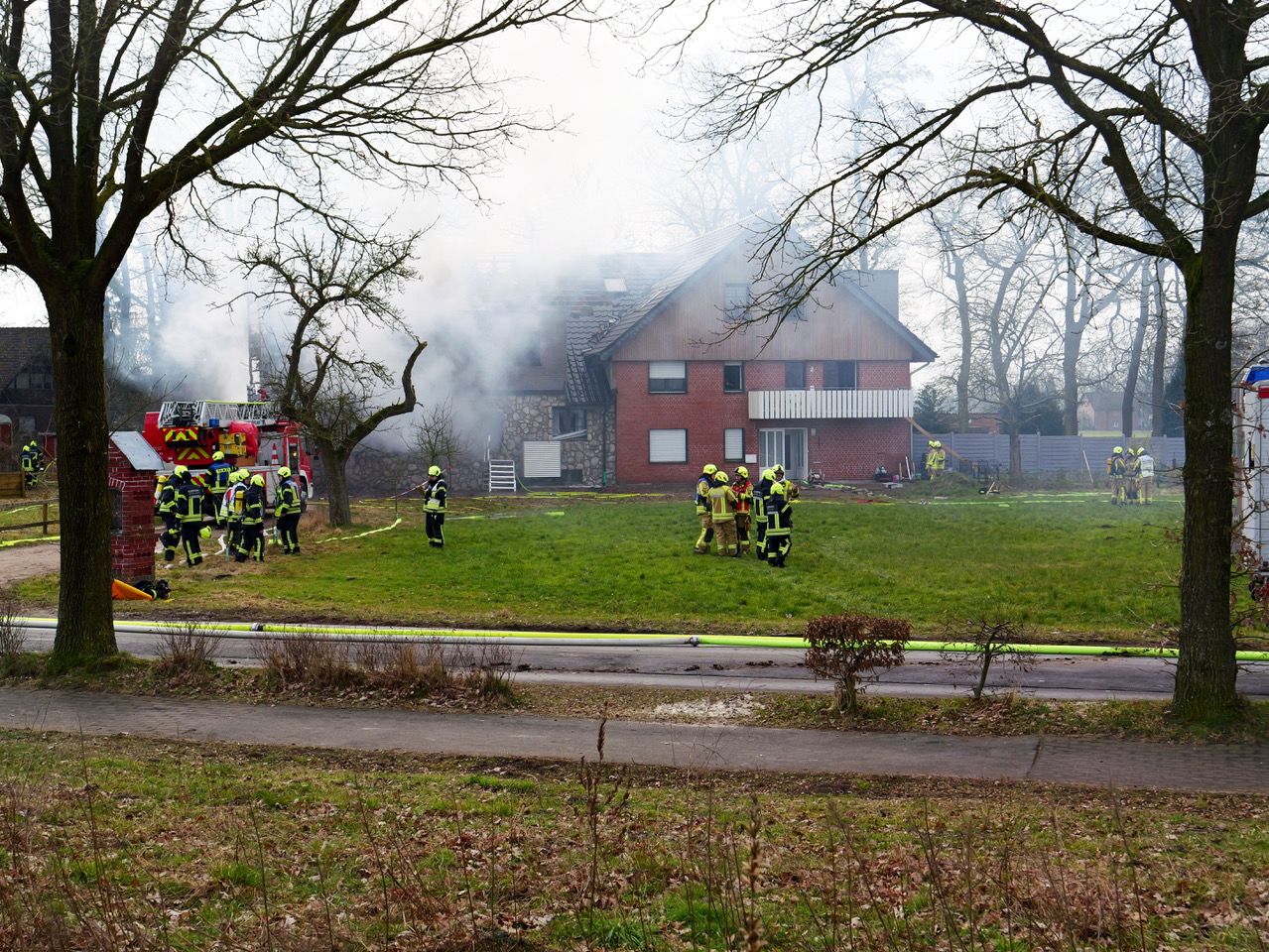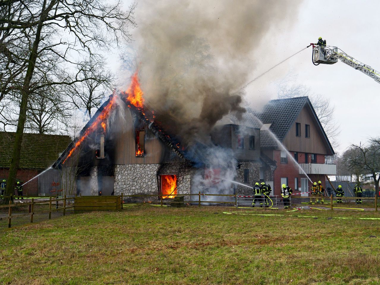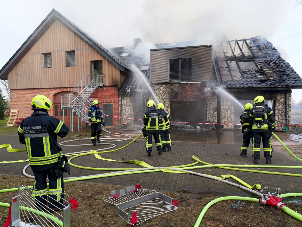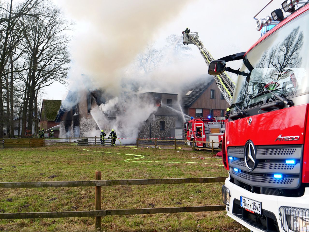 Zu einem Großeinsatz in Hövelhof sind am Freitagmorgen rund 110 Einsatzkräfte der Feuerwehren aus Hövelhof und Delbrück gerufen worden. An der Staumühler Straße brannten die Wohngebäude des ehemaligen Hofes Buschmeier, die in den vergangenen Jahren aufwendig saniert und in ein Ensemble vier Wohnungen in zwei Doppelhaushälften um- und ausgebaut worden waren.