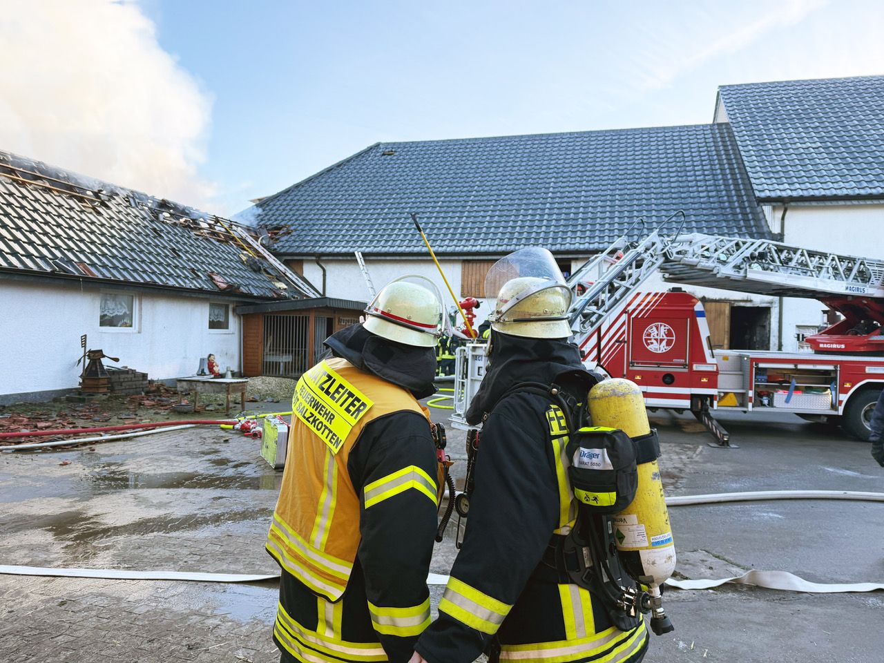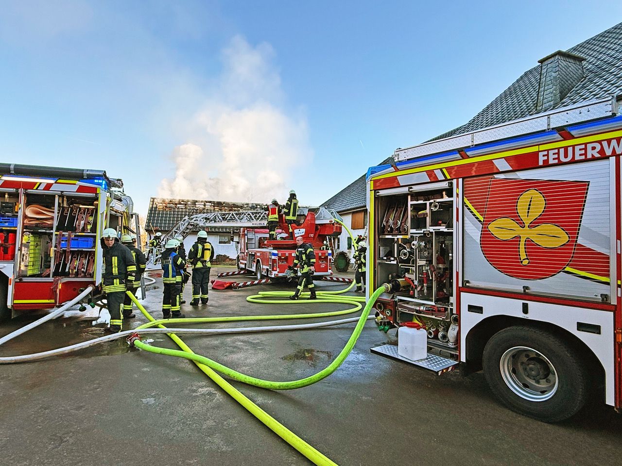Rund 80 Feuerwehrleute aus Salzkotten rückten am Samstagmittag zu einem Dachstuhlbrand auf einem landwirtschaftlichen Betrieb an der Straße Klein Verne im Salzkottener Stadtteil Verne aus. Das Feuer war aus bisher ungeklärter Ursache einem etwa 6 mal 15 Meter messenden Anbau ausgebrochen.