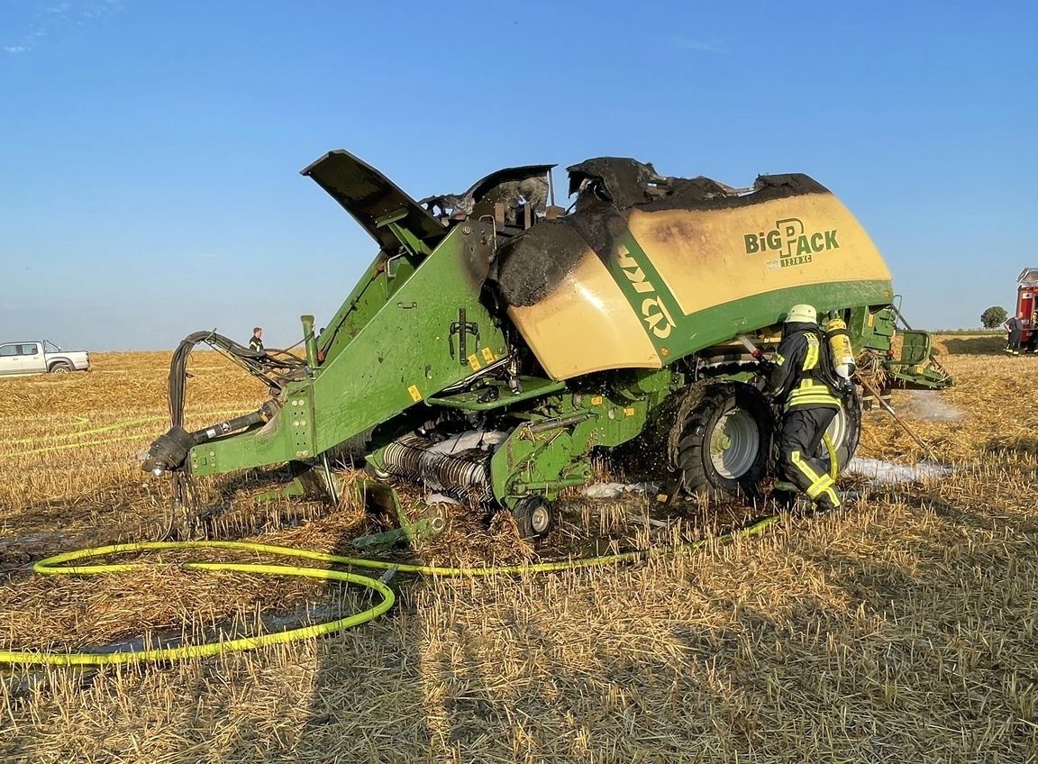 Zu einer brennenden Quaderballenpresse wurden die Einsatzkräfte des Löschzuges Bad Wünnenberg zu einem Getreidefeld nahe der Bundesstraße 480 in Fahrtrichtung Alme gerufen.