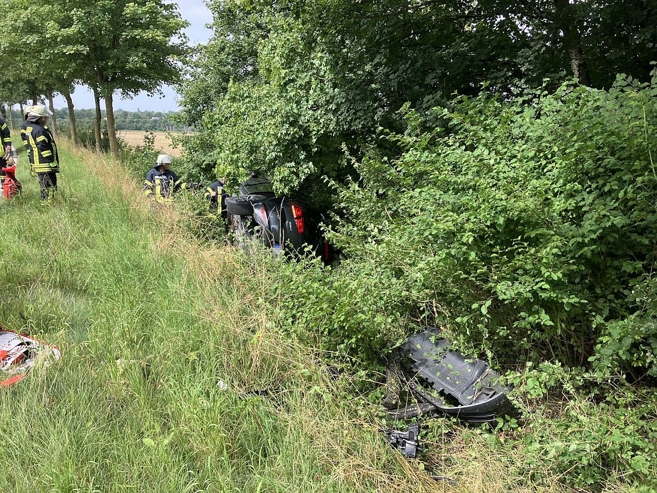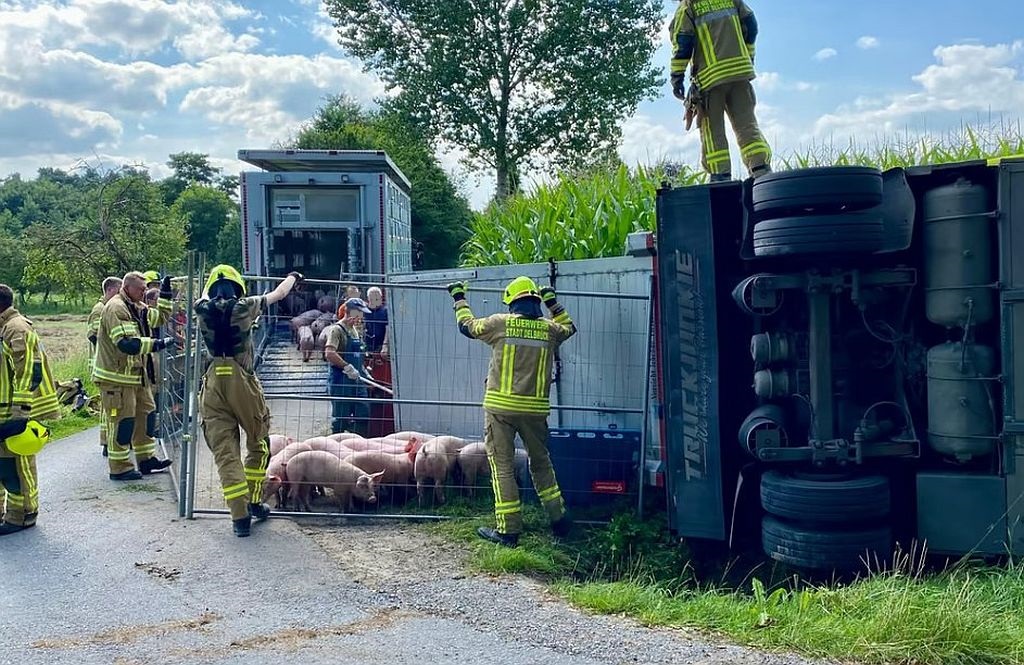 Von der Straße abgekommen und in einem Graben seitlich gelandet. Anhänger mit 120 Ferkeln in Delbrück-Bentfeld umgestürzt.