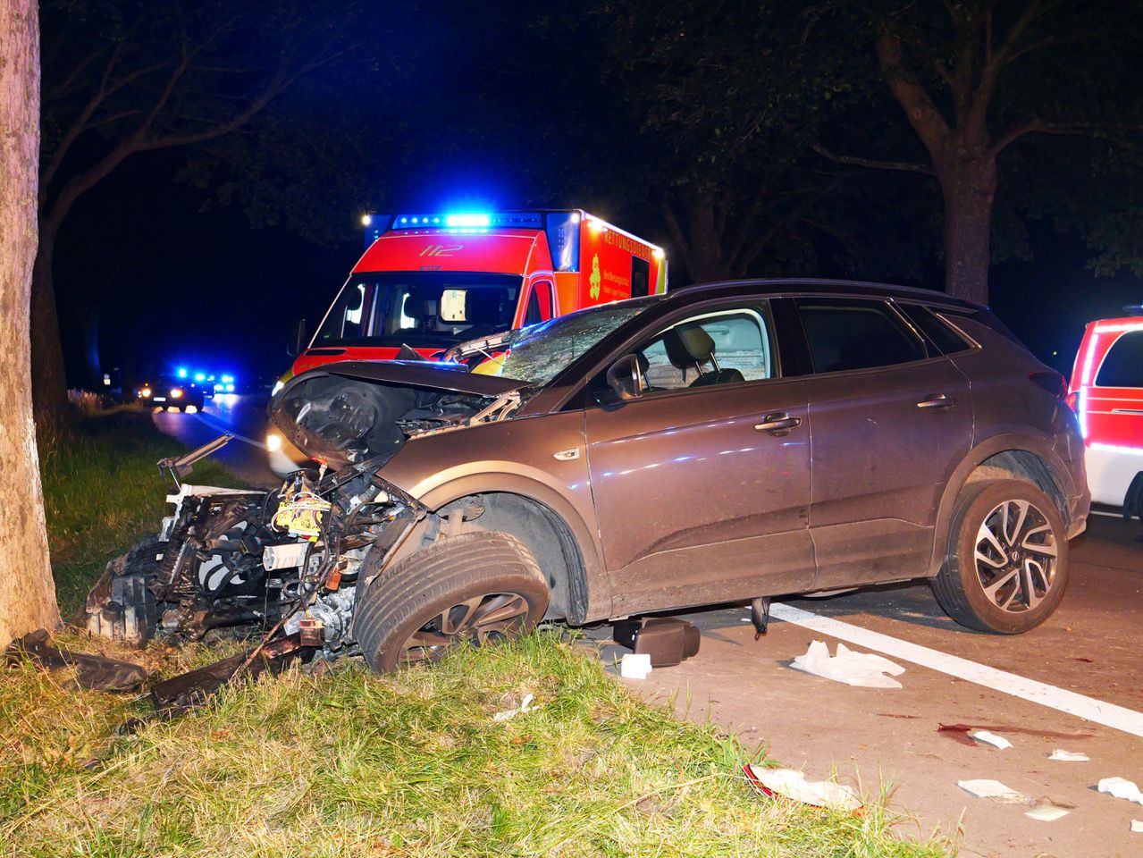 Schwerer Verkehrsunfall auf der Verner Straße: Am späten Donnerstagabend kam ein mit einem Ehepaar besetzter Opel Grandland X auf der Fahrt in Richtung Verne in Höhe der Siedlung Klein Verne aus ungeklärter Ursache nach rechts von der Fahrbahn ab und prallte frontal gegen einen massiven Straßenbaum.