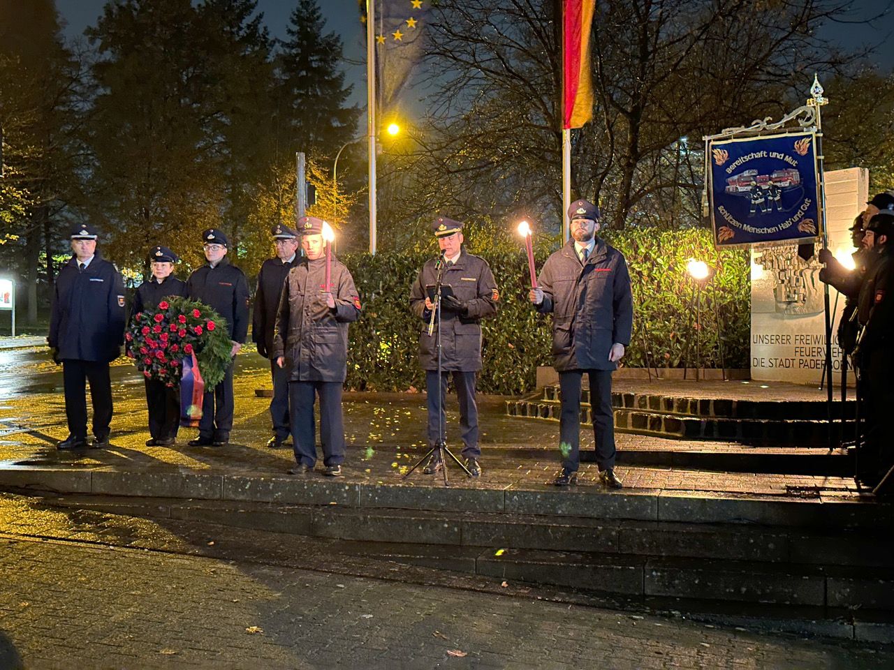 In einer Gedenkstunde am Vorabend des Volkstrauertages gedachte die Feuerwehr Paderborn der Opfer von Krieg und Gewalt weltweit sowie der Feuerwehrleute, die bei Einsätzen für ihre Mitmenschen ihr Leben gelassen haben.