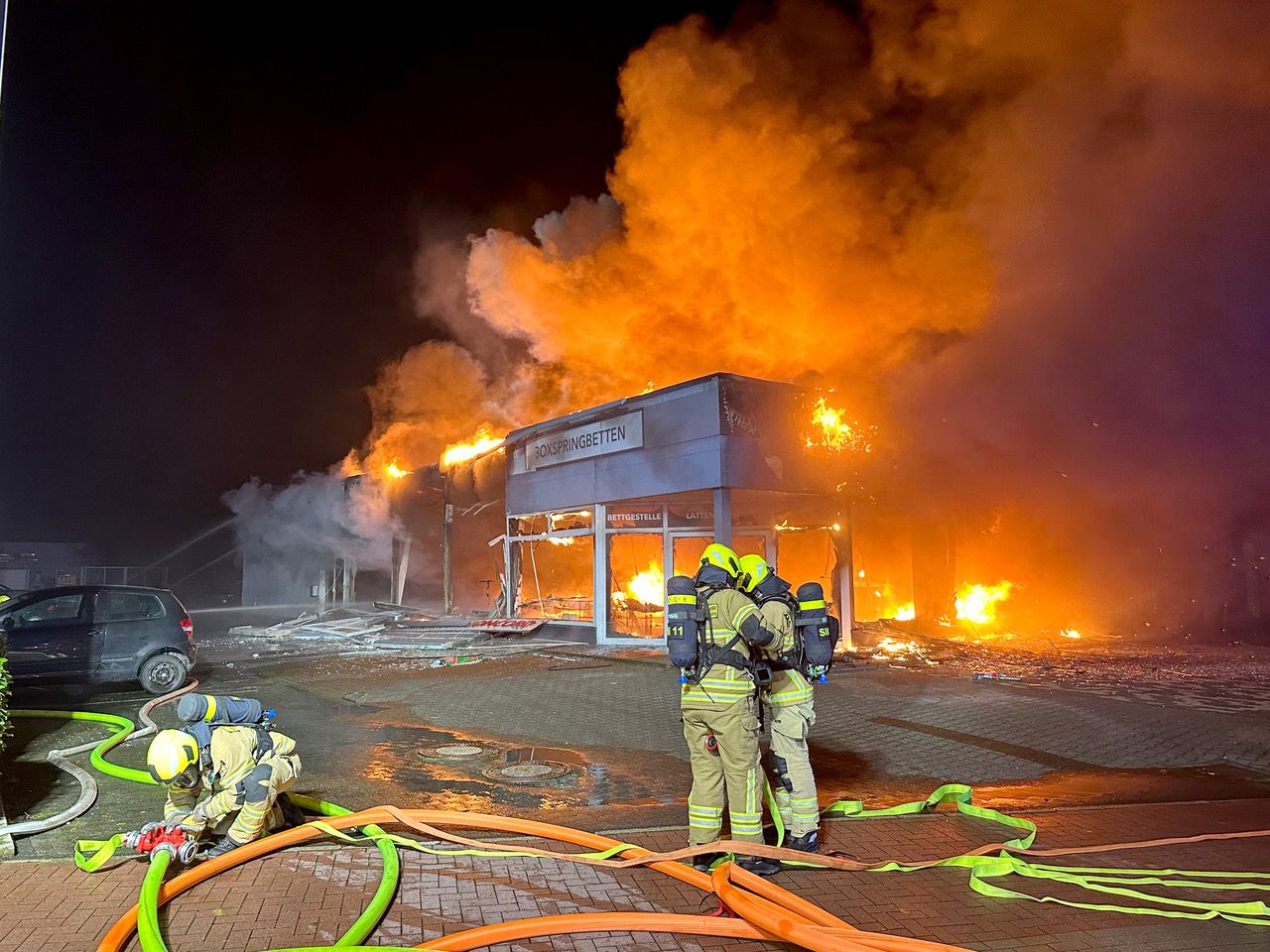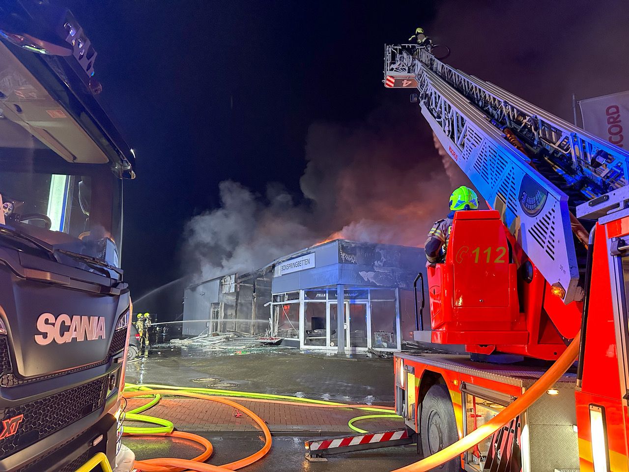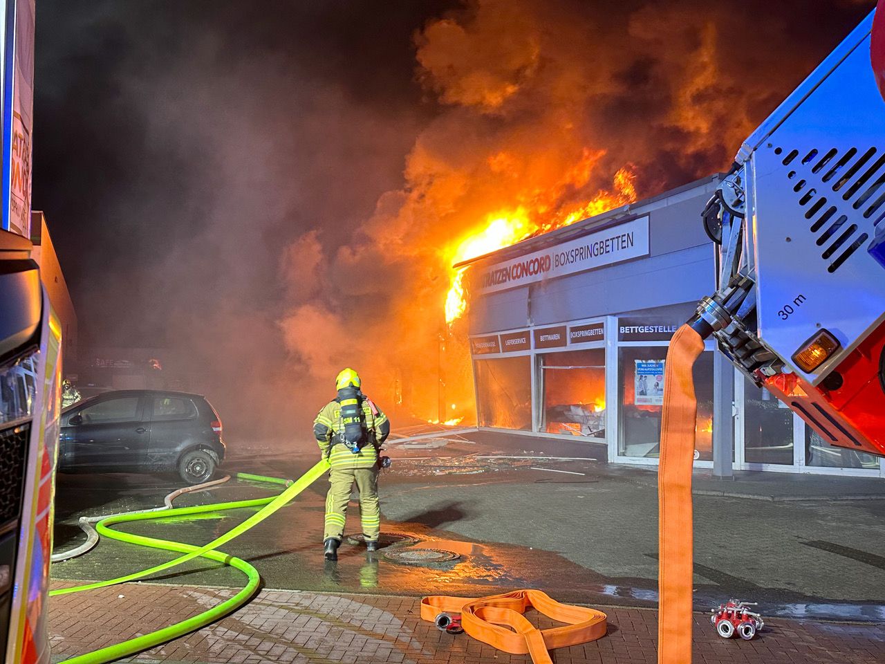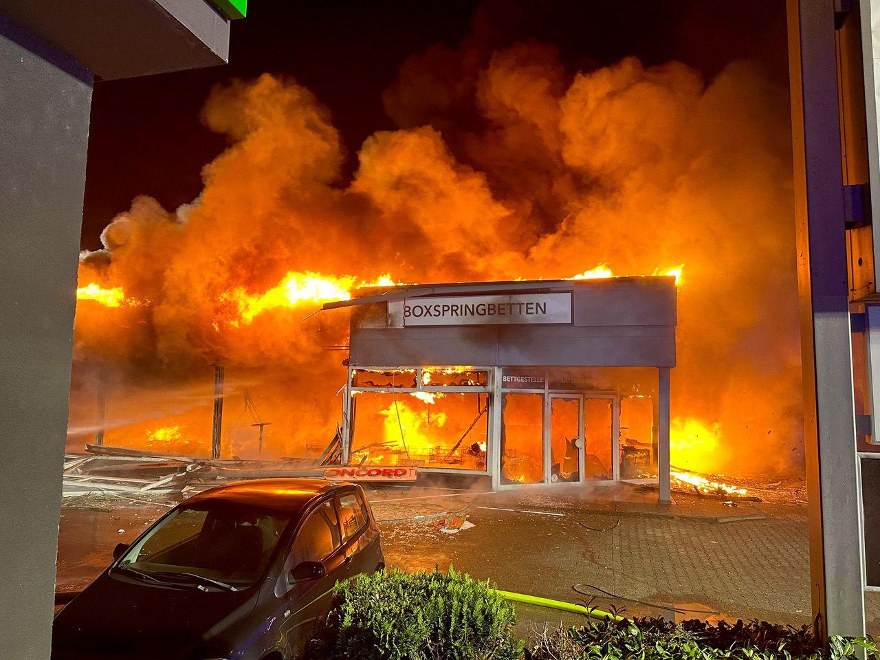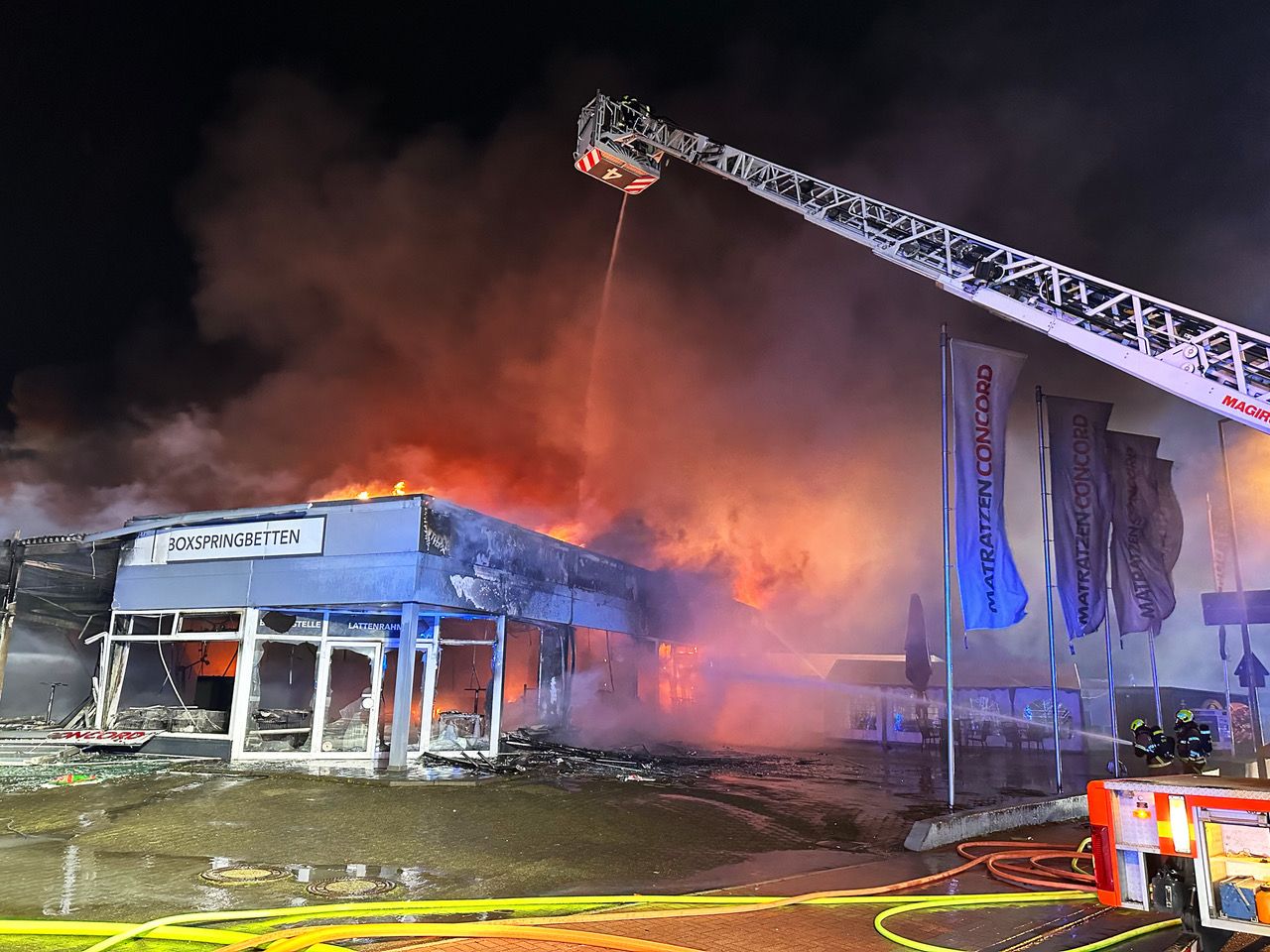Ein Großbrand hat in der Nacht zu Mittwoch eine Gewerbehalle mit mehreren Betrieben am Frankfurter Weg zerstört. Neben der Matratzen-Concord-Filiale, die vollständig ausbrannte, wurden auch eine Autowerkstatt und ein Pizza-Betrieb in den Räumen einer ehemaligen Bäckereifiliale von den Flammen zerstört. Insgesamt stand eine überbaute Fläche von mehr als 800 Quadratmetern im Vollbrand. Der Sachschaden dürfte nach Ansicht der Polizei in Millionenhöhe liegen.
