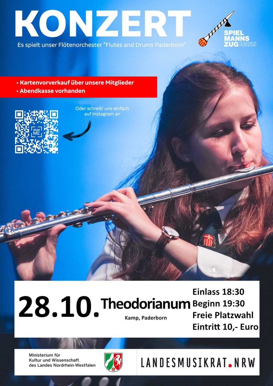 Das Flötenorchester „Flutes and Drums Paderborn" des Spielmannszuges der Feuerwehr Paderborn lädt zu einem Konzert in der Aula des Gymnasiums Theodorianum ein.