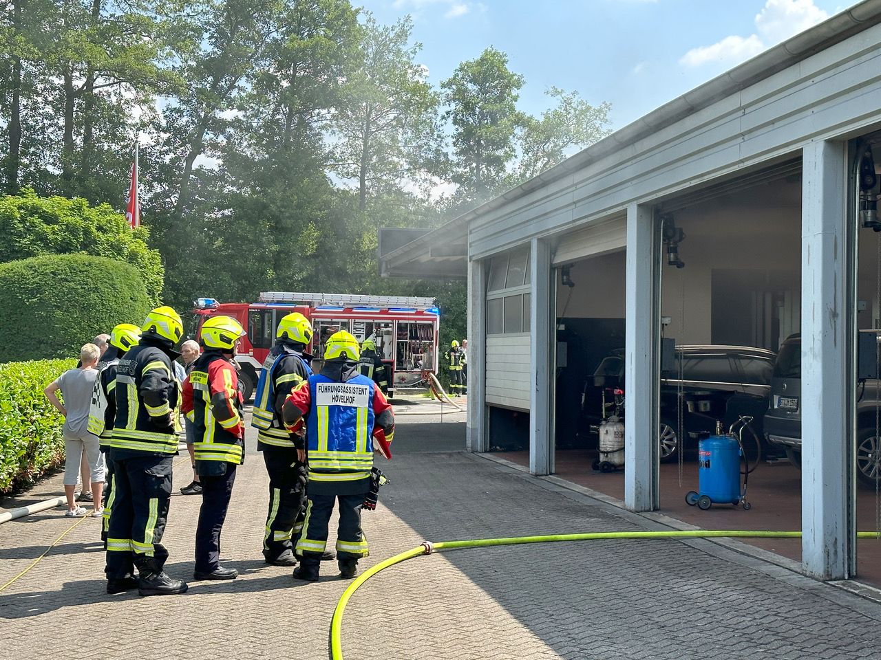 Bei Löschversuchen bei einem Brand im Lager einer Automobilwerkstatt an der Heinrichstraße im Osten der Sennegemeinde Hövelhof am Samstagmittag ist der Eigentümer verletzt worden. Nach Versorgung durch den Hövelhofer Notarzt wurde er mit einem Rettungswagen der Feuerwehr Paderborn in ein Paderborner Krankenhaus eingeliefert.