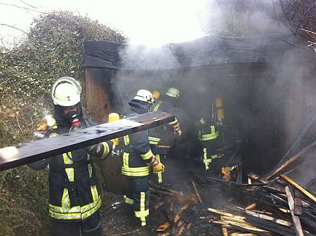 Vor Ort stellte sich die Lage so dar, dass ein mehr oder weniger in die Erde gebautes ehemaliges Saunagebäude als Trockenraum für eingelagertes Holz genutzt wurde und nun in Vollbrand stand. Erhebliche Rauchbildung machte es den Einsatzkräften bei der Brandbekämpfung schwer. Ausserdem die Situation, dass sich das Brandobjekt wie ein Stollen darstellte, in dem neben den Holzeinlagerungen auch zwei Gasflaschen zu bergen waren, von denen eine bereits brannte.