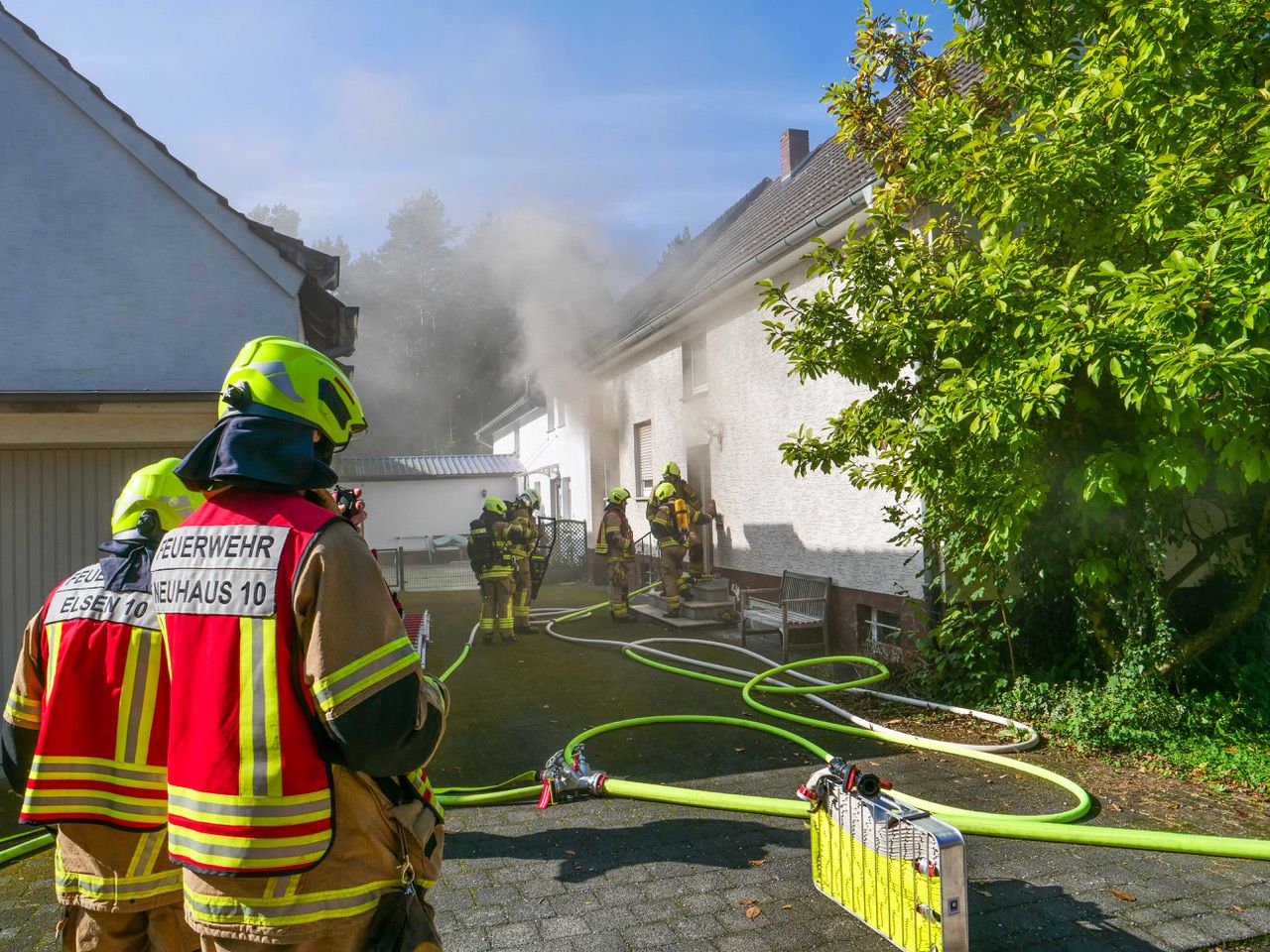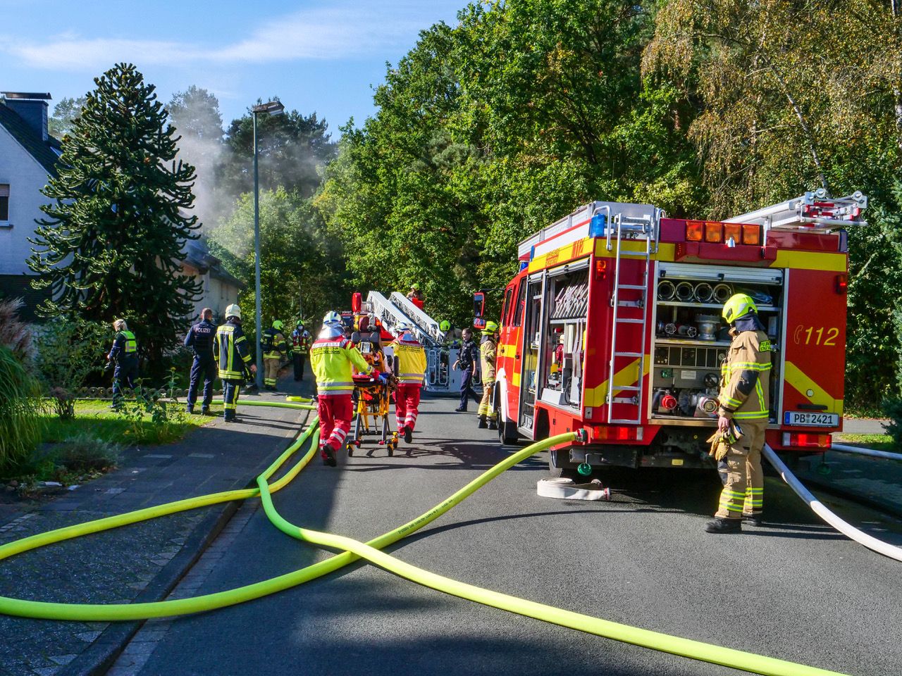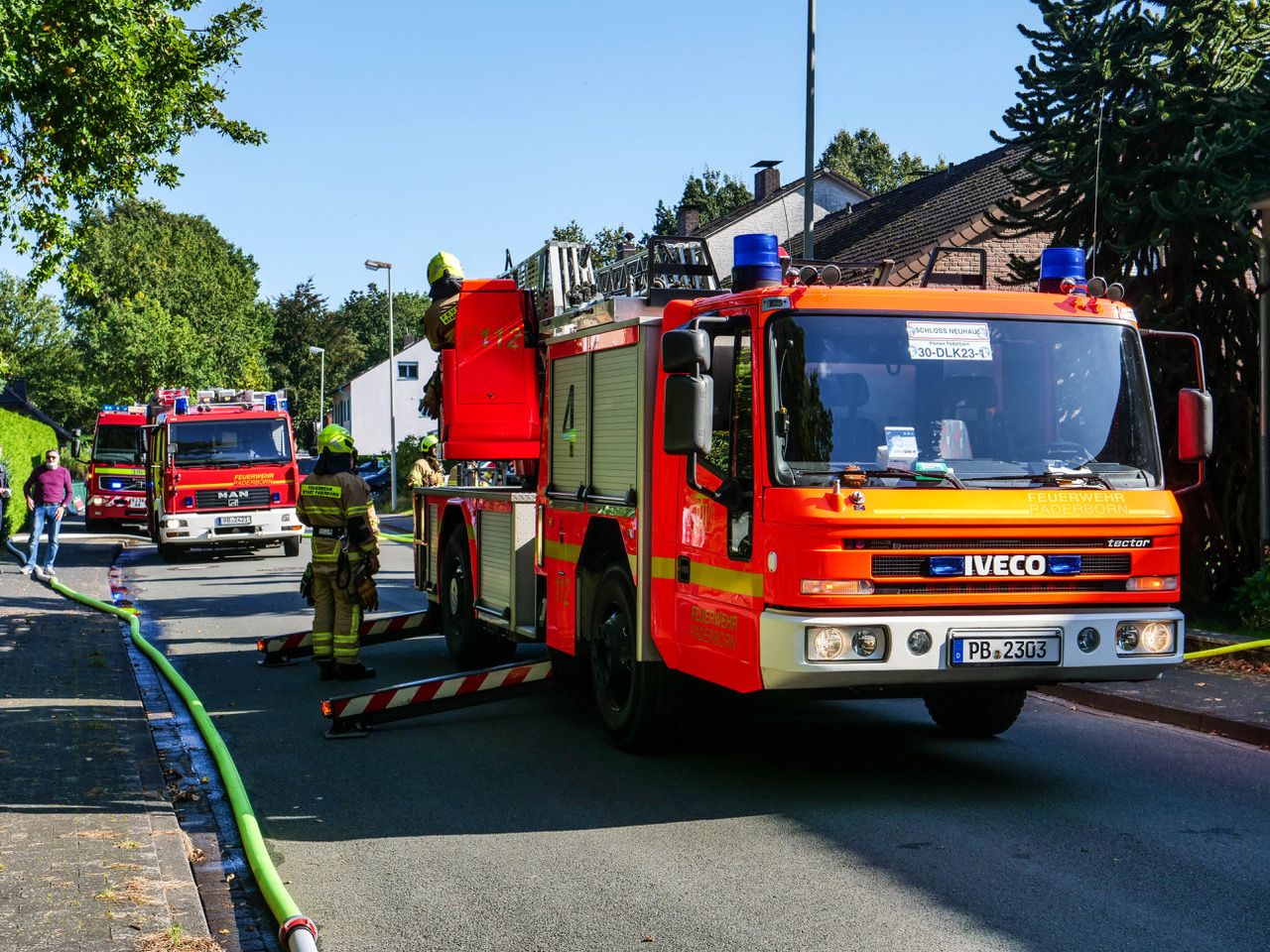Rund 50 Feuerwehrkräfte waren am Freitagmittag bei Löscharbeiten in einem Reihenhaus an der Straße Thunemühle im Paderborner Stadtteil Sennelager im Einsatz.