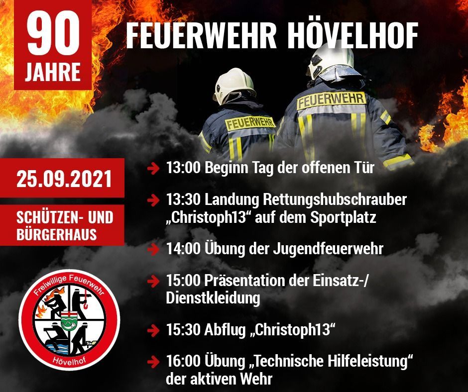 90-jähriges Jubiläum der Freiwilligen Feuerwehr Hövelhof. Tag der offenen Tür am 25.09.2021 am Schützen- und Bürgerhaus in Hövelhof von 13 bis 18 Uhr.