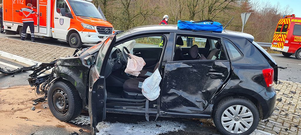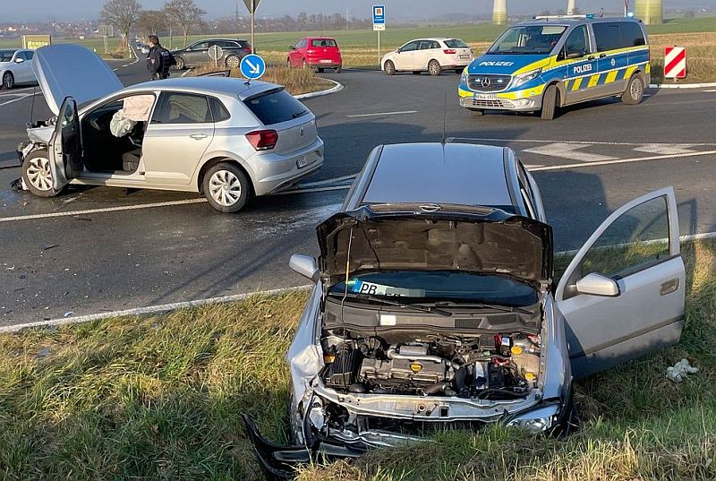Beim Zusammenstoß von zwei Personenwagen auf der Bundesstraße 64 in Höhe Benhausen wurden am Samstagmittag zwei Autofahrer verletzt. Die Kollision ereignete sich gegen 13.30 Uhr im Bereich der Einmündung der der Straße Im Knick (L 937) in die Bundesstraße 64.