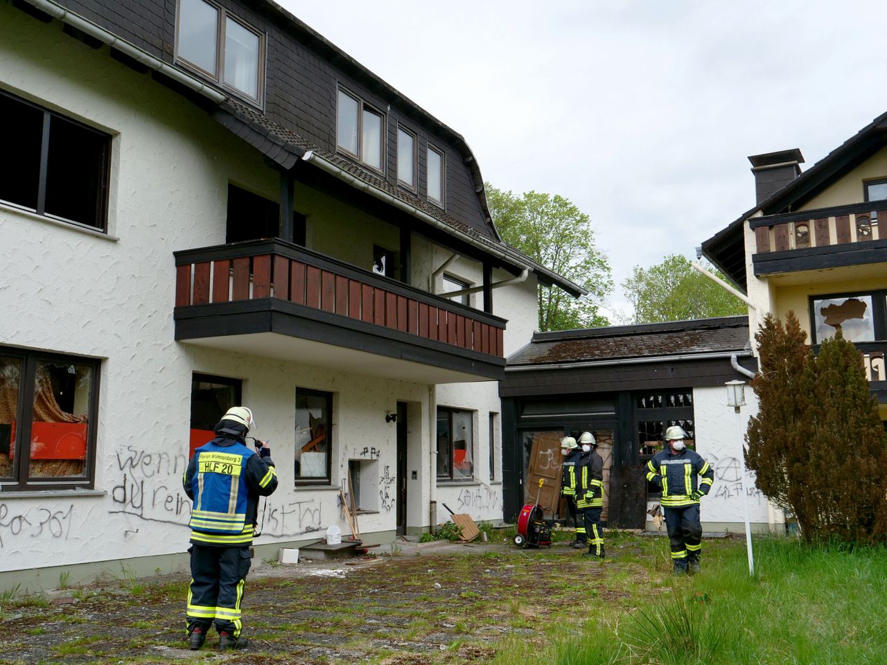 Erneut brennt es im leerstehenden Aabach-Hotel. Feuerwehr wird durch den starken Ausflugsverkehr auf der Anfahrt behindert.