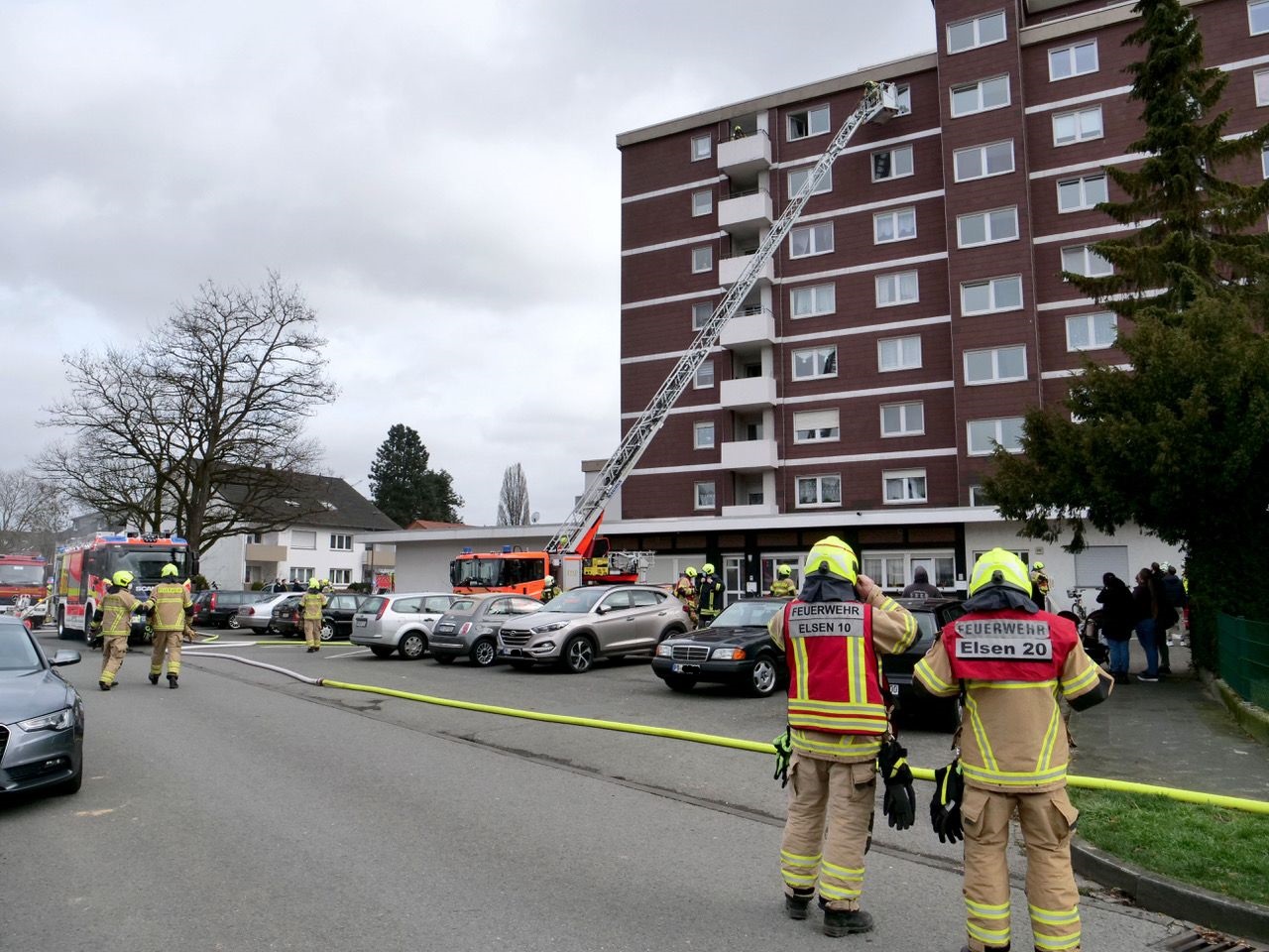 Feuerwehreinsatz am Sonntagnachmittag in der Ernst-Reuter-Straße im Stadtteil Schloss Neuhaus. Gegen 14.30 Uhr nahm ein Bewohner des Hochhauses Brandgeruch wahr und wählte den Notruf. Um 14.33 Uhr wurde die Paderborner Feuerwehr unter dem Stichwort „Zimmerbrand, Menschenleben in Gefahr“ alarmiert.