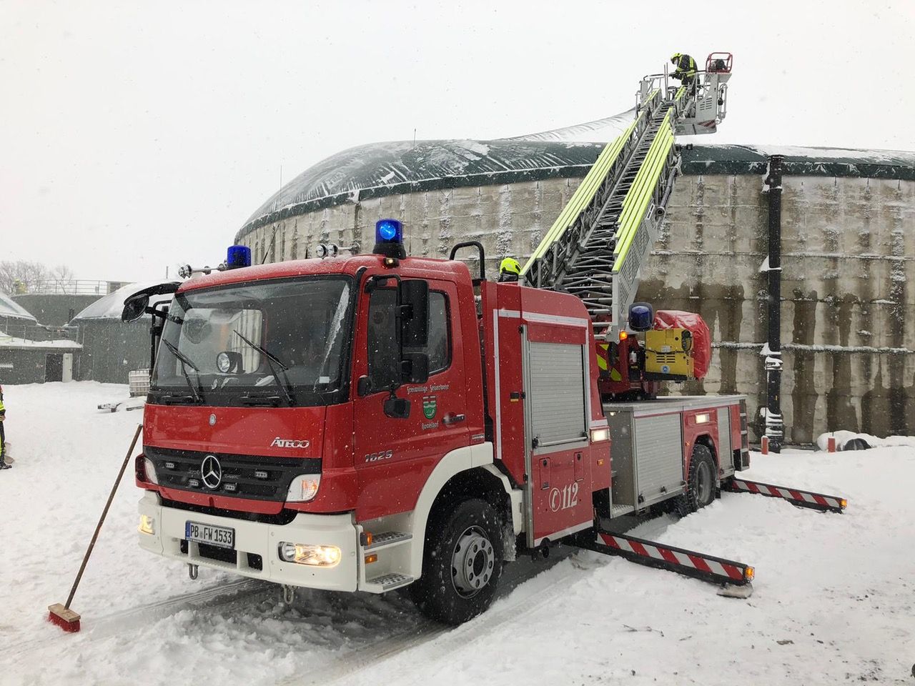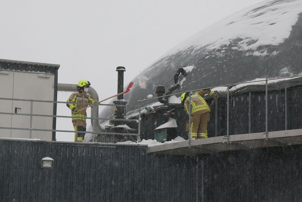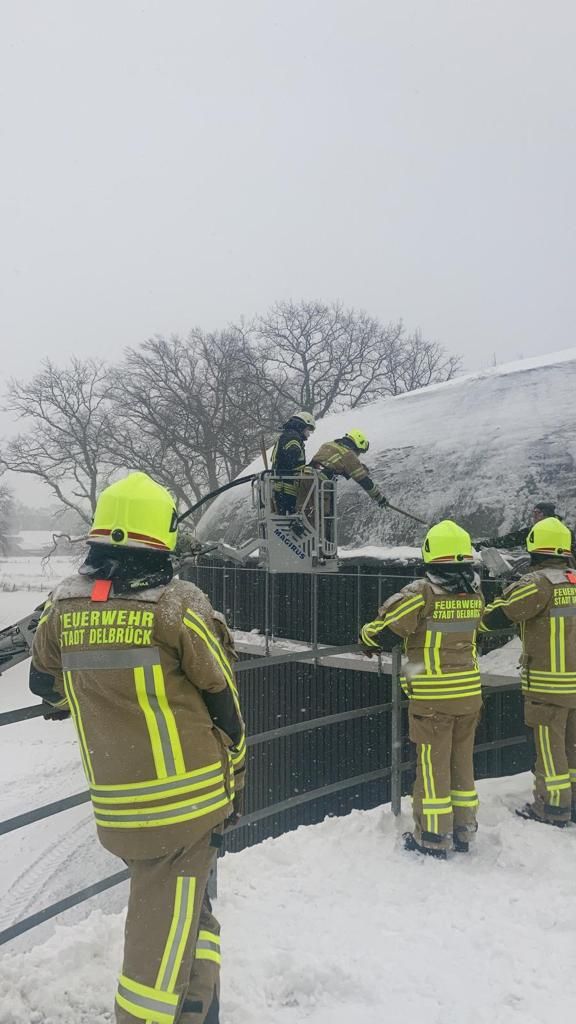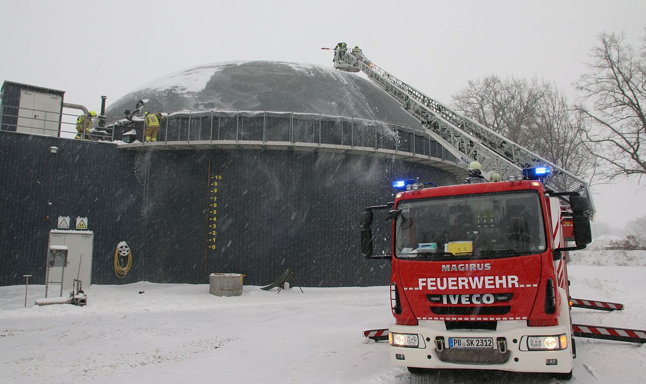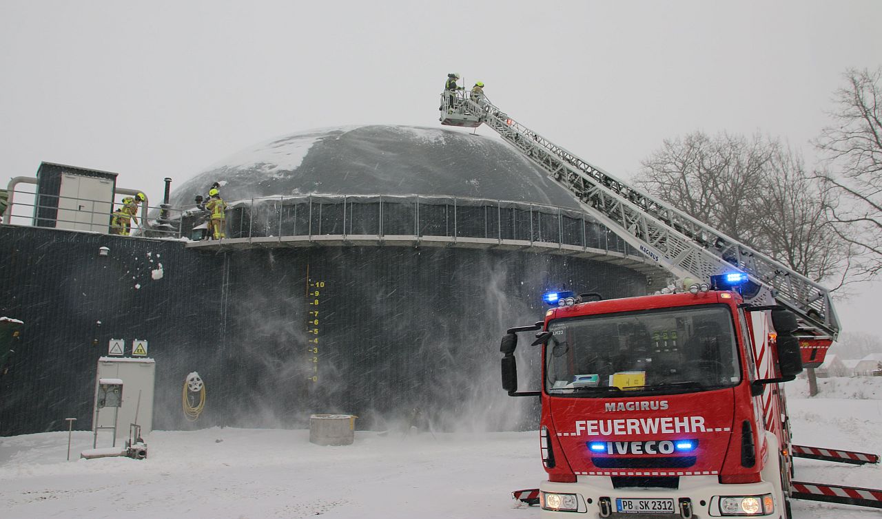 Für die Feuerwehr entwickelte sich am Sonntagmorgen ein Einsatzschwerpunkt in Delbrück. Schneemassen drohten die Kunststoffdeckungen der Biogasanlagen in Boke, Steinhorst und Westenholz einzureißen, teilte Kreisbrandmeister Elmar Keuter mit. Nur aus dem Korb der Drehleiter ließen sich die Kuppeln vor Schnee befreien.