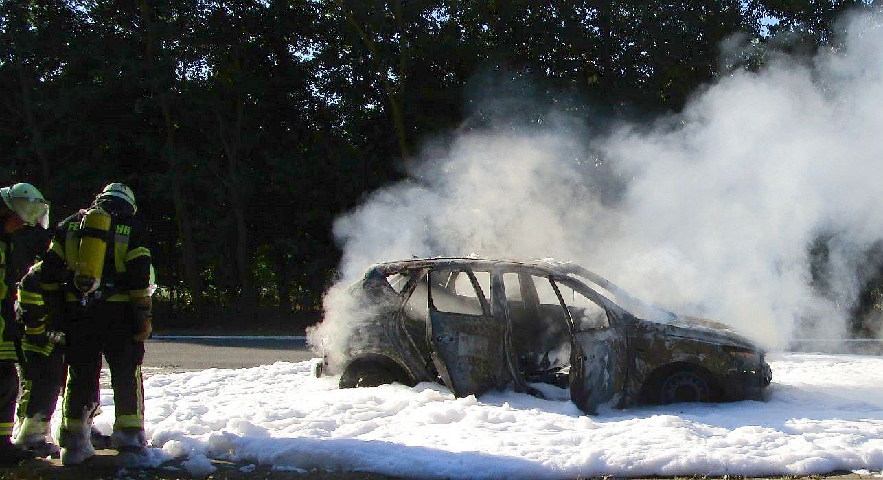 Haaren. Bei Eintreffen der Feuerwehr stand das Fahrzeug bereits im Vollbrand. Die Feuerwehr setzte unter Atemschutz ein Schaumrohr zur Brandbekämpfung ein.