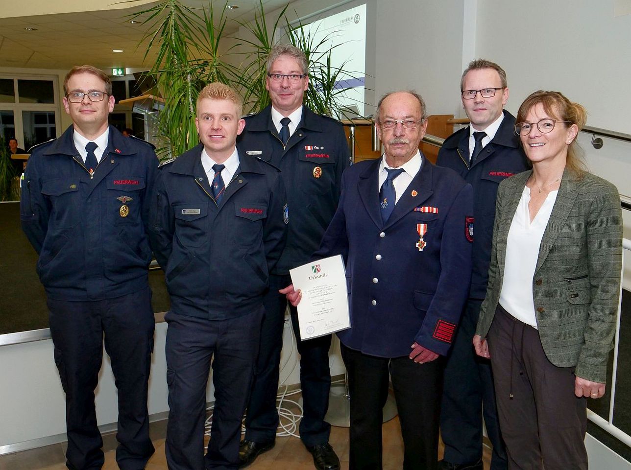 Für 50 Jahre aktive Mitgliedschaft in der Freiwilligen Feuerwehr zeichnete Wehrführer Christoph Michaelis Unterbrandmeister Burkhard Jüstel von der Löschgruppe Dalheim mit dem Feuerwehr-Ehrenzeichen des Landes in Gold mit Goldkranz aus.