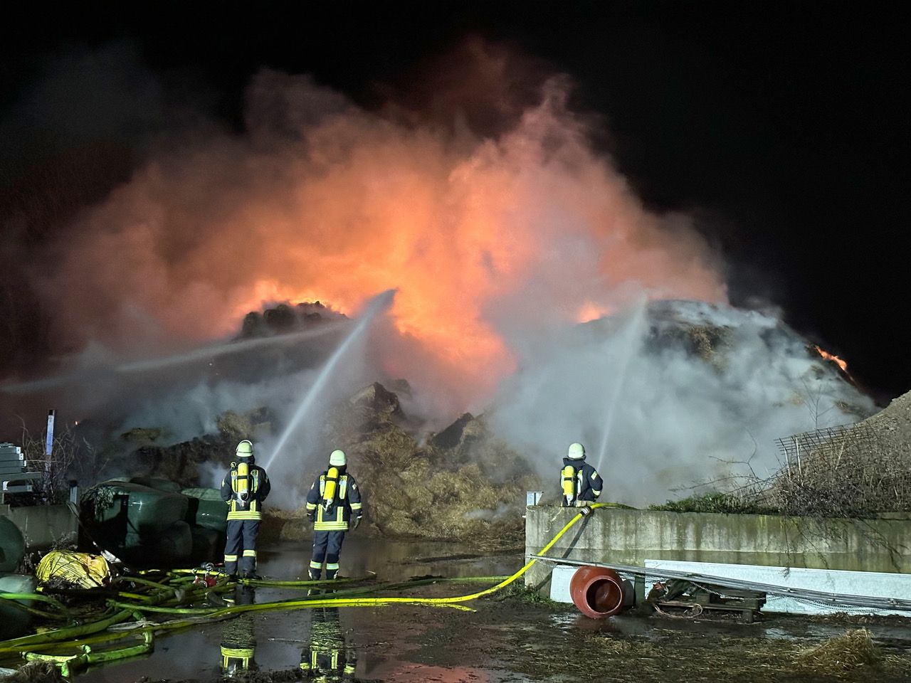 Großbrand auf einem Bauernhof im Salzkottener Stadtteil Verlar. In der Nacht zu Freitag stehen auf einem Bullenmastbetrieb an der Straße Lange Wenne südlich der Lippstädter Straße knapp 2.000 Strohballen in Flammen. Diese quaderförmigen Ballen haben pro Stück ein Gewicht von rund 250 Kilo.