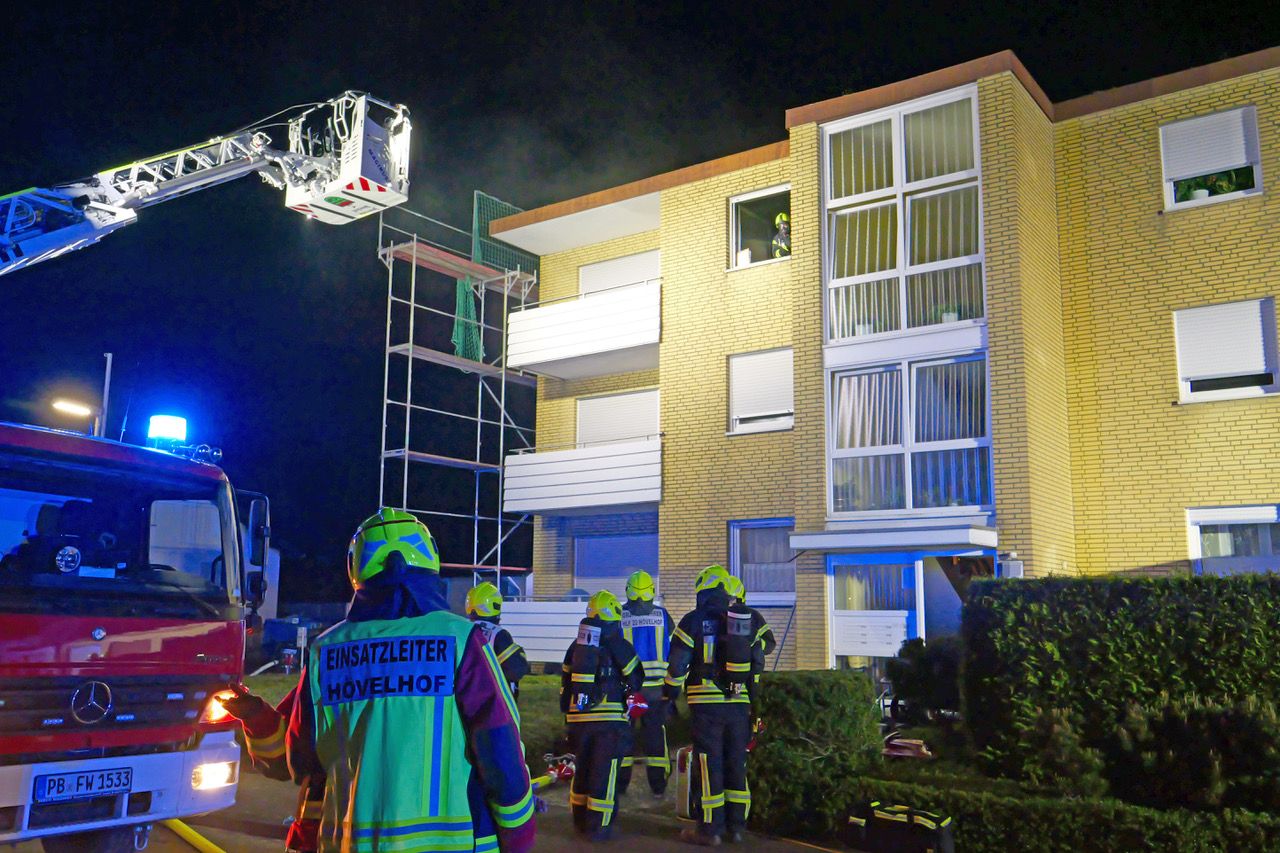 Um 20.35 alarmierte die Leitstelle des Kreises Paderborn die Feuerwehr Hövelhof, die umgehend mit allen Fahrzeugen und etwa 45 Feuerwehrleuten unter der Leitung von Maximilian Rempe, stellvertretender Leiter der Sennewehr, zur Raiffeisenstraße ausrückte, berichtet Feuerwehrsprecher Tim Kesselmeier. Auch der Feuerwehrarzt, zwei Rettungswagen der Feuerwehr Paderborn und die Einsatzgruppe des Deutschen Roten Kreuzes fuhren zur Brandstelle