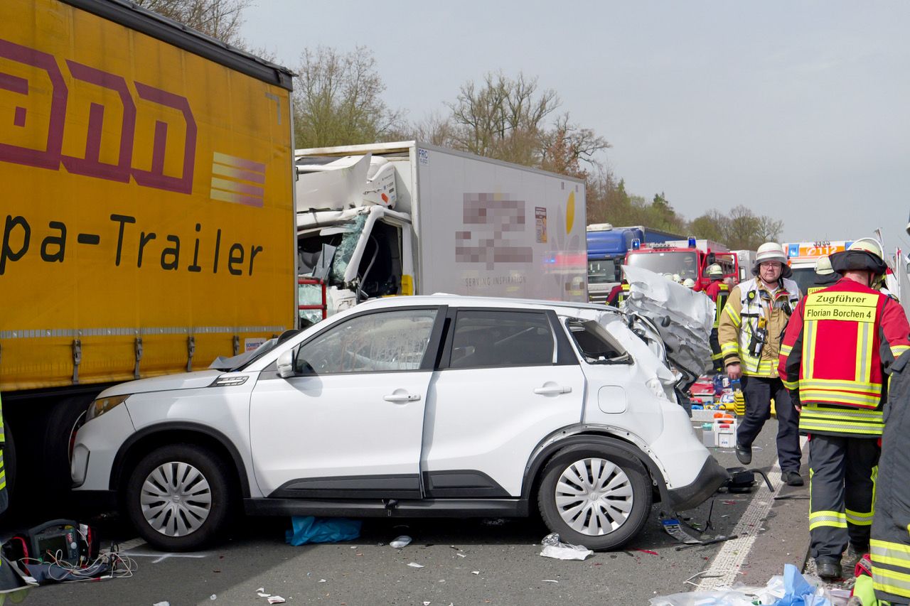 Borchen. Der Unfall ereignete sich gegen 13.40 Uhr auf der Richtungsfahrbahn Bad Wünnenberg, etwa 600 Meter vor dem Autobahnkreuz Bad Wünnenberg. Dort kam es zu einem Rückstau vor einer Baustelle, da dort seit geraumer Zeit wegen der Bauarbeiten nur ein Fahrstreifen zur Verfügung steht. Einem Sattelzug aus dem Kreis Gütersloh gelang es noch, rechtzeitig anzuhalten. Ein nachfolgender Lkw aus Freiburg (Baden-Württemberg) fuhr nach Aussagen von Unfallzeugen auf einen mit zwei Personen besetzten Pkw der Marke Suzuki auf und schob ihn unter den Auflieger des Sattelzuges. Dabei wurde die gesamte rechte Seite des Pkw aufgerissen.