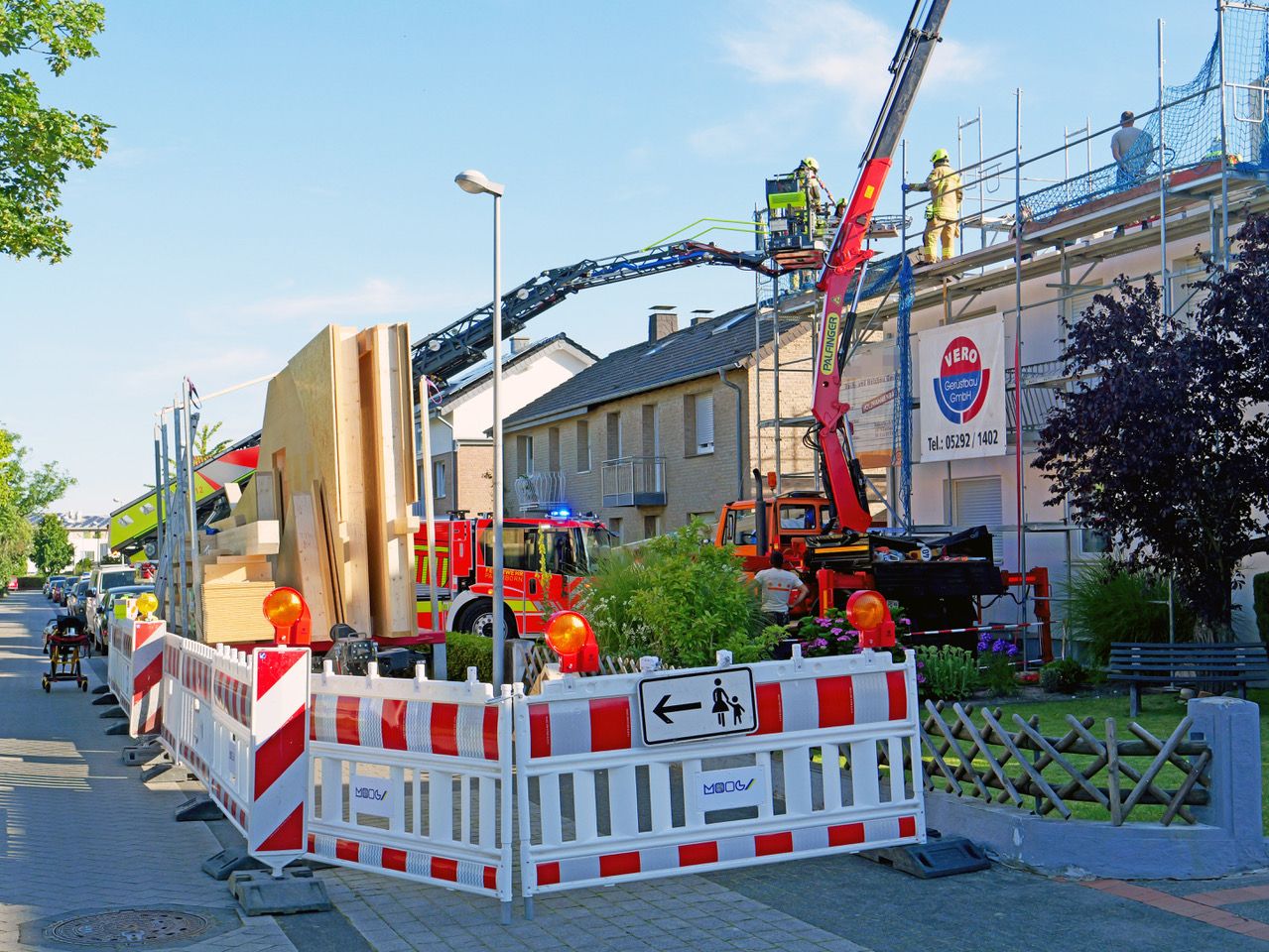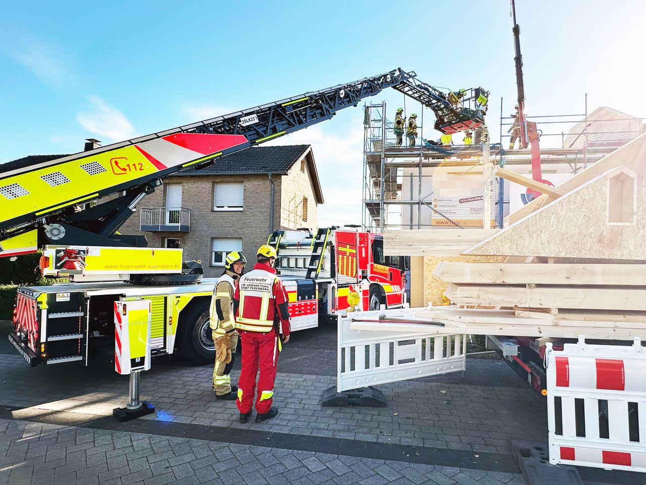 Paderborn. Der Unfall ereignete sich nachersten Erkenntnissen gegen 7.30 Uhr. In dem Mehrfamilien-Reihenhaus gegenüber des St.-Vincenz-Altenzentrums wird zurzeit oberhalb des ersten Obergeschosses ein Ausbau des Dachgeschosses in Holzrahmenbauweise vorgenommen. Per Kran wurden die vorgefertigten Holzelemente auf die Decke des ersten Obergeschosses gehoben. Dabei wurde aus ungeklärter Ursache ein Mitarbeiter des Unternehmens im Becken- und Beinbereich unter einem der großformatigen Holzelemente eingeklemmt.