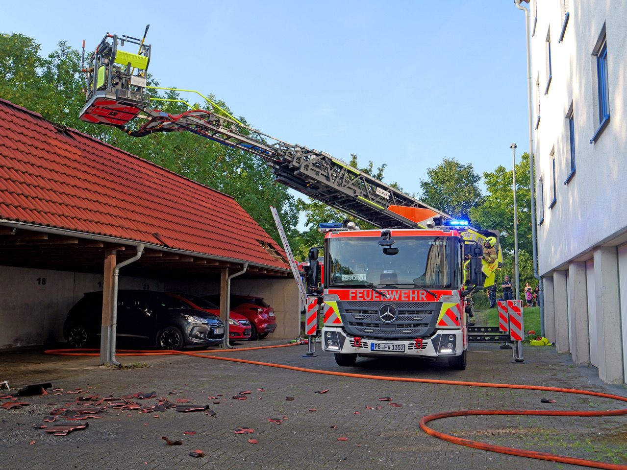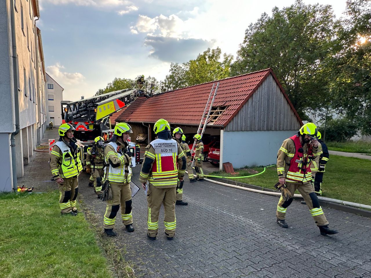 Paderborn. Um 19.11 wurden zunächst zwei Löschfahrzeuge der Feuer- und Rettungswache Süd und der ehrenamtlichen Einheit Benhausen wegen eines Kleinbrandes im Freien - einer Mülltonne - alarmiert. Acht Minuten später stellte sich die Situation dramatischer dar: die brennenden Mülltonnen, die in einem abgetrennten Bereich der Remise untergestellt waren, hatten auch den Dachstuhl der Remise in Brand gesetzt.