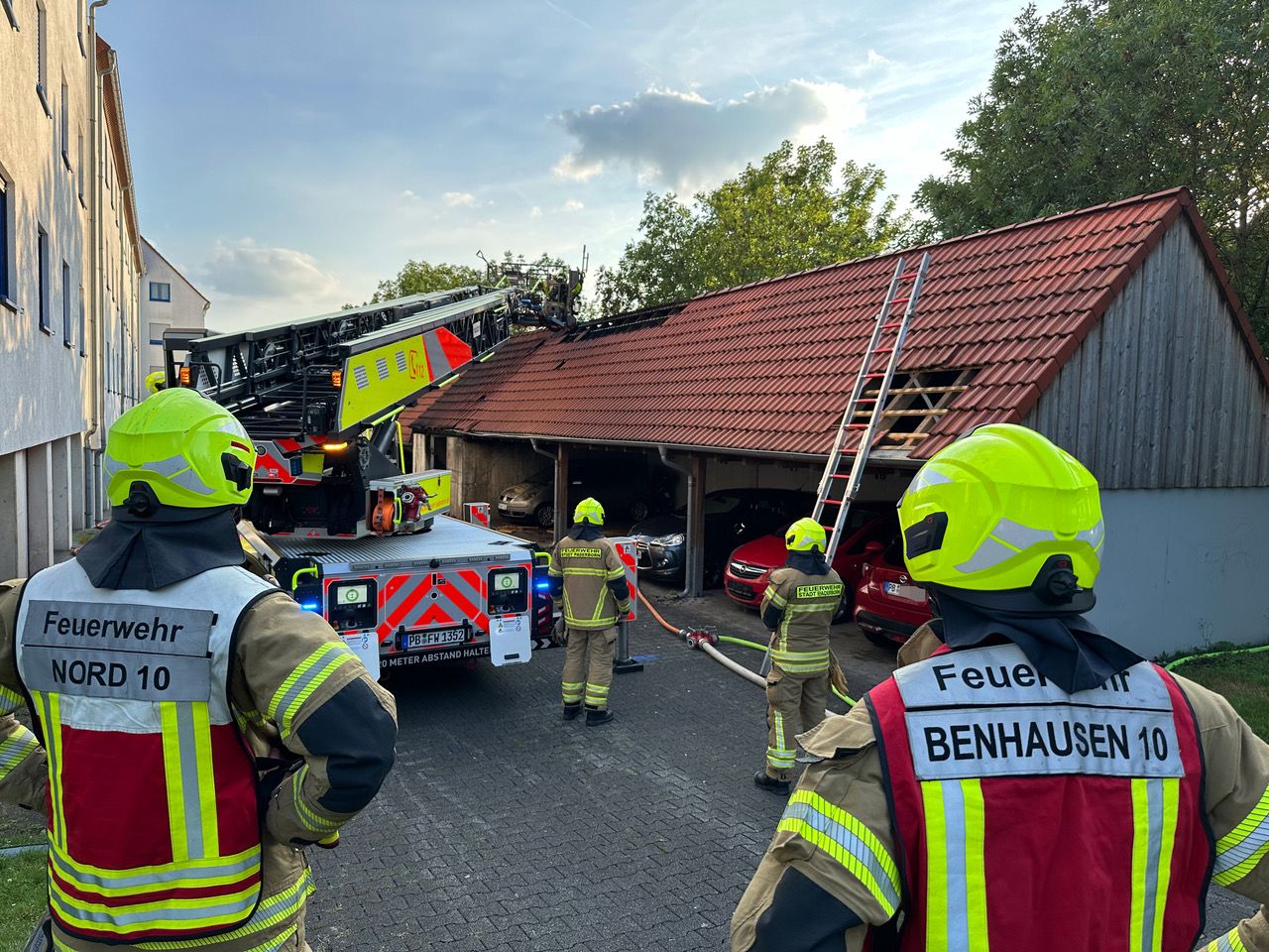 Da ein Übergreifen auf das benachbarte Wohnhaus nicht ausgeschlossen werden konnte, wurde die Alarmstufe ein weiteres Mal erhöht: Brand mit Ausdehnung auf bauliche Einrichtungen. Und so rückte ein weiteres Fahrzeug der Einheit Benhausen sowie die beruflichen Kräfte der Feuer- und Rettungswache Nord Richtung Kaukenberg aus, berichtet Einsatzleiter Maximilian Neubert. Die ehrenamtlichen Einheiten Stadtmitte und Stadtheide besetzten die verwaisten Wachen.