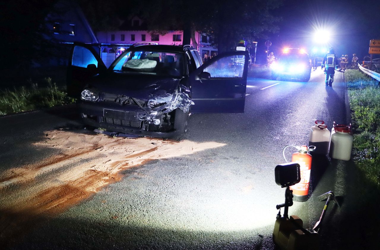 Gegen 21.25 Uhr beabsichtigte ein 61-jähriger Fahrer mit seinem VW Golf Plus aus der Schlinger Straße kommend die Lippstädter Straße zu überqueren. Mit im Fahrzeug befand sich ein 86-jähriger Beifahrer. Der 61-jährige übersah einen sich aus Richtung Delbrück nähernden VW Golf Kombi mit einem 44-jährigen am Steuer. Der Kombi prallte auf der Fahrerseite in das Heck des Golf Plus und drehte diesen dadurch um fast 180 Grad herum und kam wenige Zentimeter vor dem Brückengeländer der Brücke im Zuge des Leiwesdamm zum Stillstand. Der Kombi rutschte noch rund 50 Meter auf der Lippstädter Straße weiter, ehe er mit einem massiven Frontschaden liegen blieb. Alle Unfallbeteiligten konnten sich selber aus den Fahrzeugen befreien.