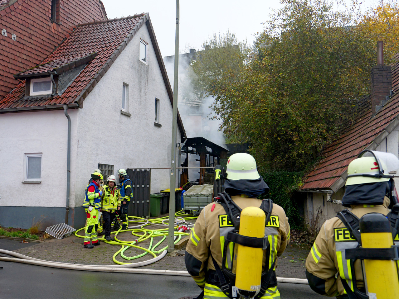 Lichterloh brannte am Dienstagnachmittag ein knapp 30 Quadratmeter großer Holzanbau im Garten des zweieinhalbgeschossigen Wohnhauses an der Unteren Sage in Altenbeken. Aus bisher unbekannter Ursache war der Holzbau, in dem Gartengeräte, Fahrräder und eine 11 Kilo-Gasflasche gelagert waren gegen 13.30 Uhr in Brand geraten.