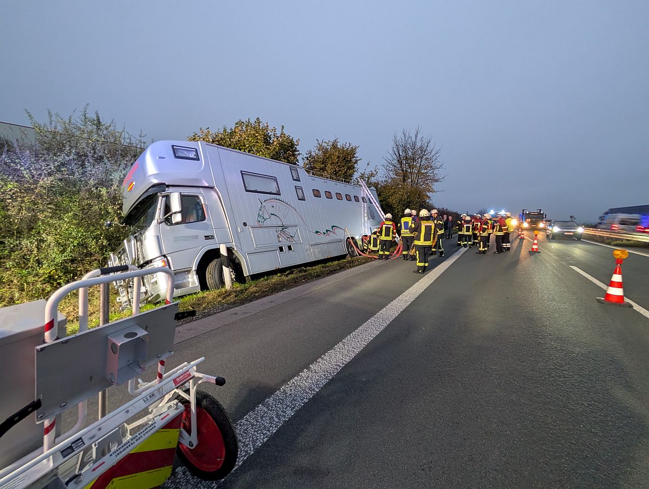 Da der Transporter nicht aus dem Graben gezogen werden konnte ohne den Pferden weiteren Stress zuzumuten und um ein Kippen des LKW zu vermeiden, entschieden wir uns die Pferde aus dem Fahrzeug zu retten und noch auf der Autobahn in einen anderen Transporter zu führen, welcher über die Leitstelle nachgefordert wurde. Ein Tierarzt vom Veterinäramt wurde ebenfalls zur Einsatzstelle alarmiert.