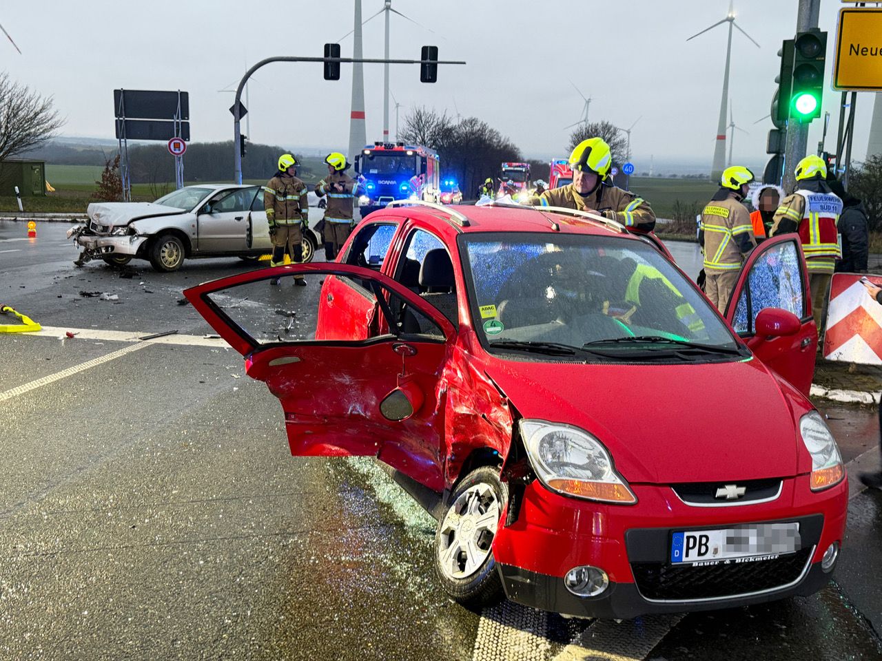 An der Unfallstelle befreiten die Feuerwehrleute mit hydraulischen Werkzeugen die eingeschlossene und schwer verletzte Beifahrerin des Kleinwagens aus ihrer Zwangslage. Auch eine weitere Mitfahrerin erlitt in dem Matiz schwere Verletzungen. Zwei weitere Beteiligte wurden leicht verletzt. Alle vier wurden zur weiteren Behandlung in Paderborner Krankenhäuser eingeliefert. Die rund 25 Einsatzkräfte unterstützten den Rettungsdienst, sicherten die Unfallstelle ab, stellten den Brandschutz sicher, kümmerten sich um das Batteriemanagement und streuten auslaufende Betriebsstoffe ab.
