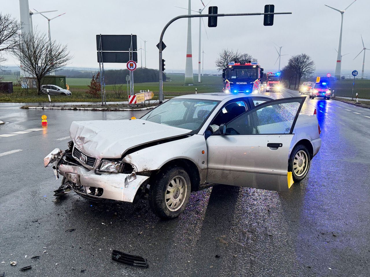 Beim Zusammenstoß von zwei Personenwagen auf der Bundesstraße 64 im Zuge der Kreuzung mit der Kreisstraße 1 wurden am Sonntagnachmittag insgesamt vier Personen verletzt, zwei von ihnen schwer.