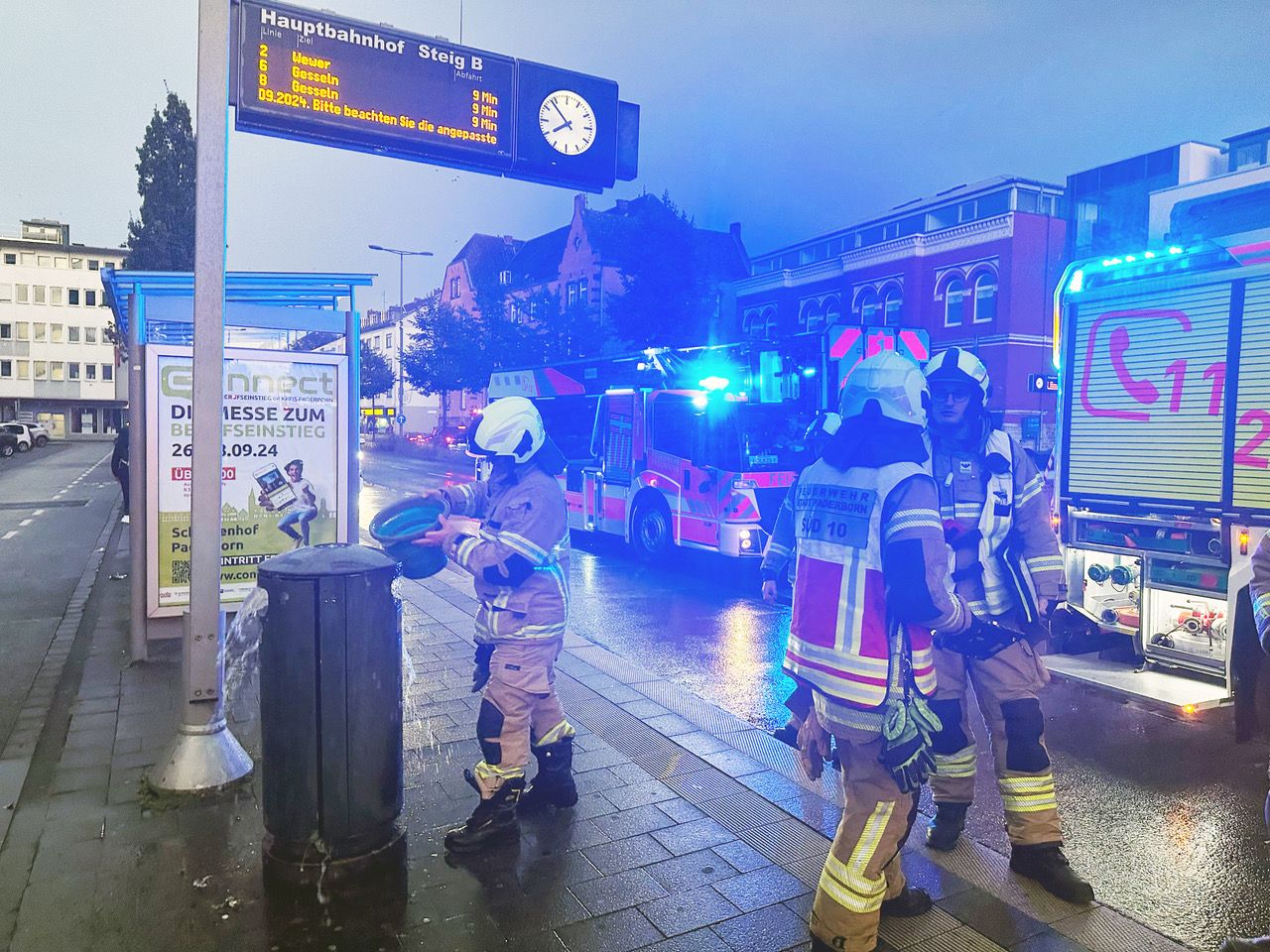Kleine Ursache, große Wirkung. Ein qualmender Papierkorb am Bussteig B an der Haltestelle Hauptbahnhof in der Bahnhofstraße löste am Freitagabend einen größeren Feuerwehreinsatz aus, der jedoch in bewährter Weise routiniert abgearbeitet wurde.