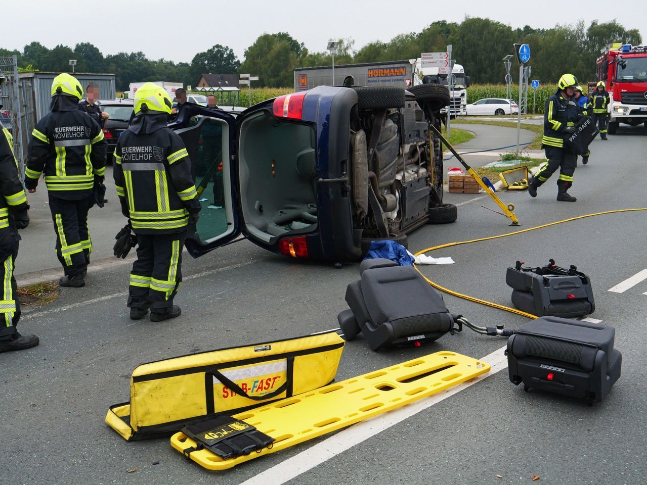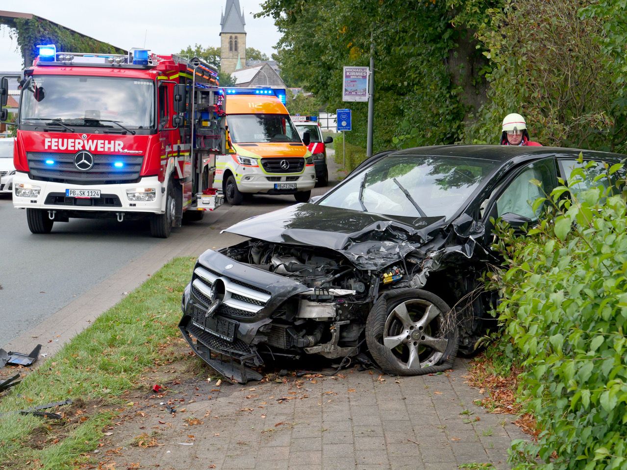 Auto prallt in Hövelhof seitlich gegen Baum und kippt auf Fahrerseite. Feuerwehr befreit eingeschlossene Autofahrerin.