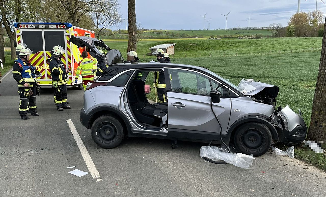 Bei einem schweren Verkehrsunfall auf der Fürstenberger Straße (Landstraße 636) ist am Donnerstagmorgen ein mit zwei Personen besetzter Opel Crossland von der Fahrbahn abgekommen und frontal gegen einen Straßenbaum geprallt. Dabei wurden beide Insassen eingeklemmt und schwer verletzt.