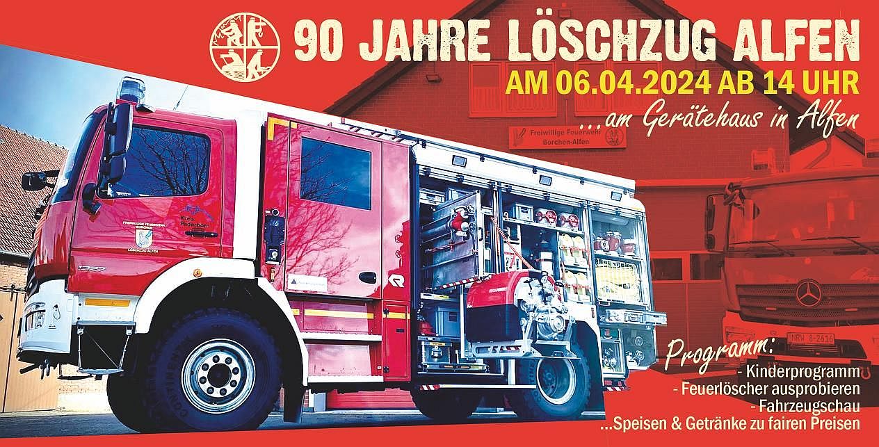 Der Löschzug Alfen feiert am 6. April sein 90-jähriges Bestehen. Zu diesem Jubiläum öffnet der Löschzug Alfen am 06. April 2024 seine Tore und lädt alle Bürgerinnen und Bürger recht herzlich ein.