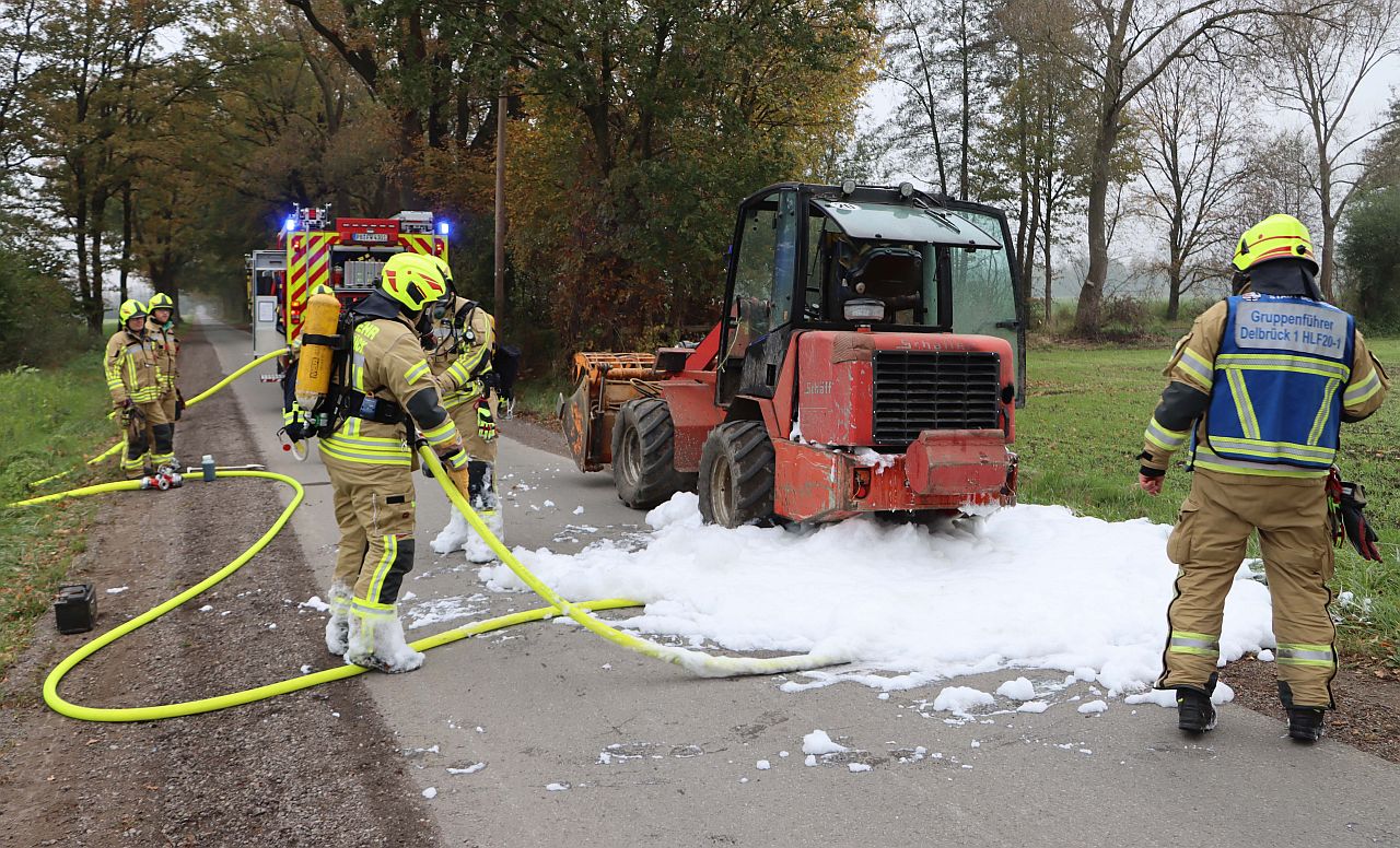 Technischer Defekt im Motorbereich als Ursache vermutet. Motorraum eines Radladers gerät in Brand.