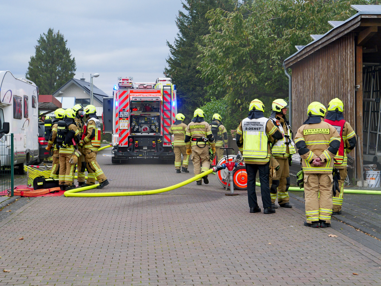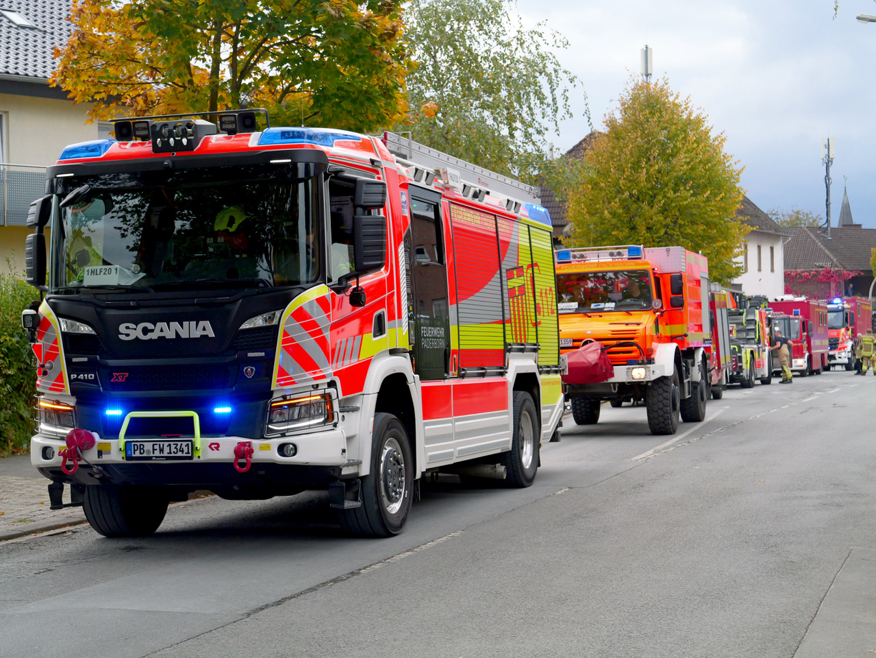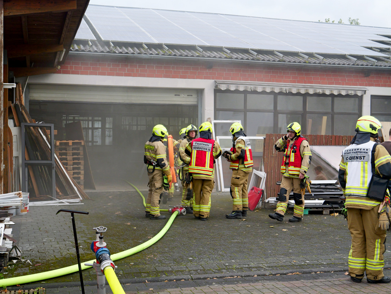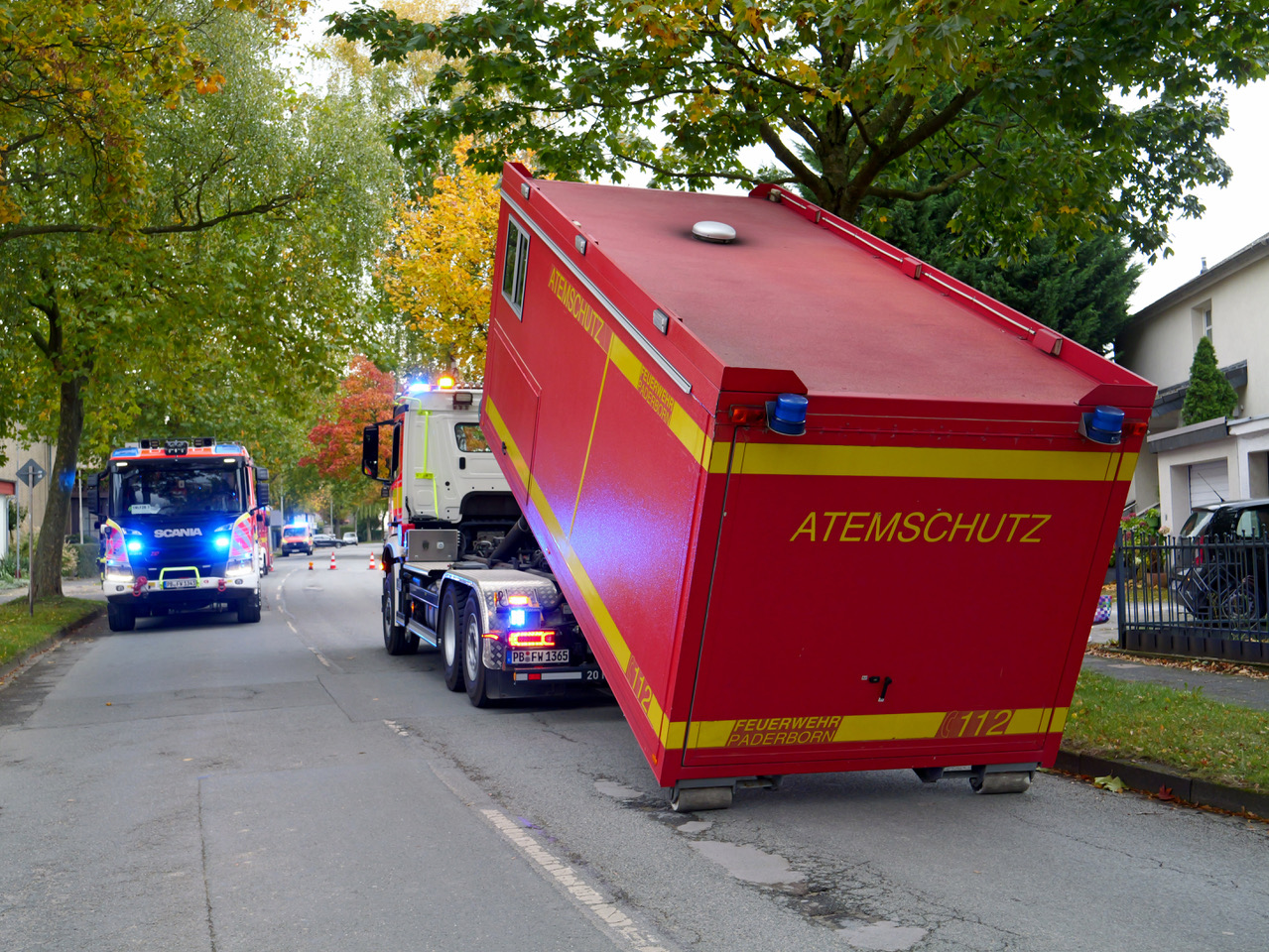Zu einem Großeinsatz rückte die Feuerwehr Paderborn am Donnerstagnachmittag in den Stadtteil Benhausen aus. In einem Tischlereibetrieb an der Straße Hainhöfen war ein Brand in der Hackschnitzelanlage ausgebrochen. Der rund 30 Kubikmeter fassende Behälter war zu einem guten Teil gefüllt, und beißender Rauch füllte rasch den Werkstattbereich in dem rund 25 mal 30 Meter überbauten Areal.