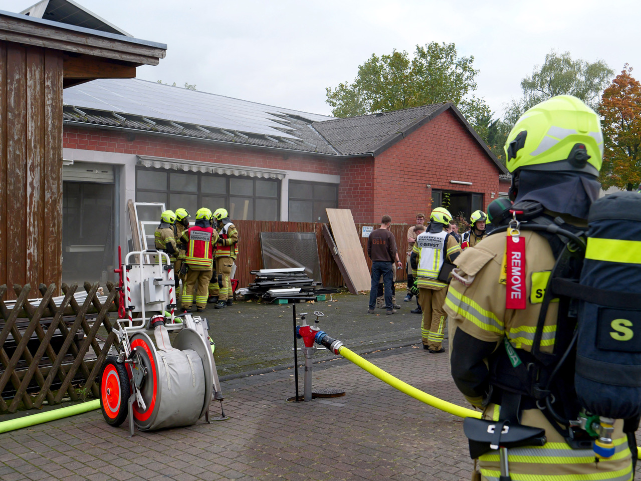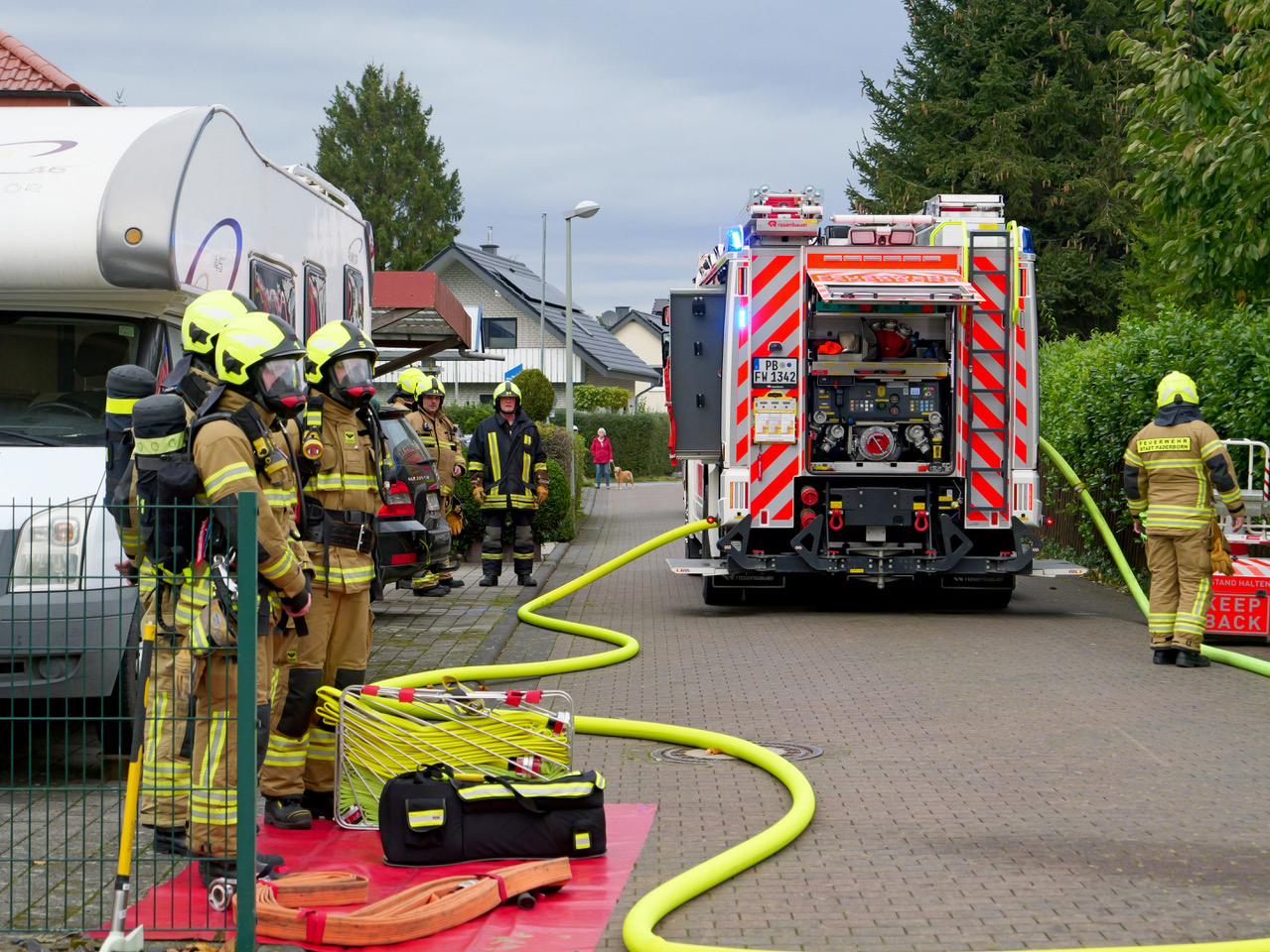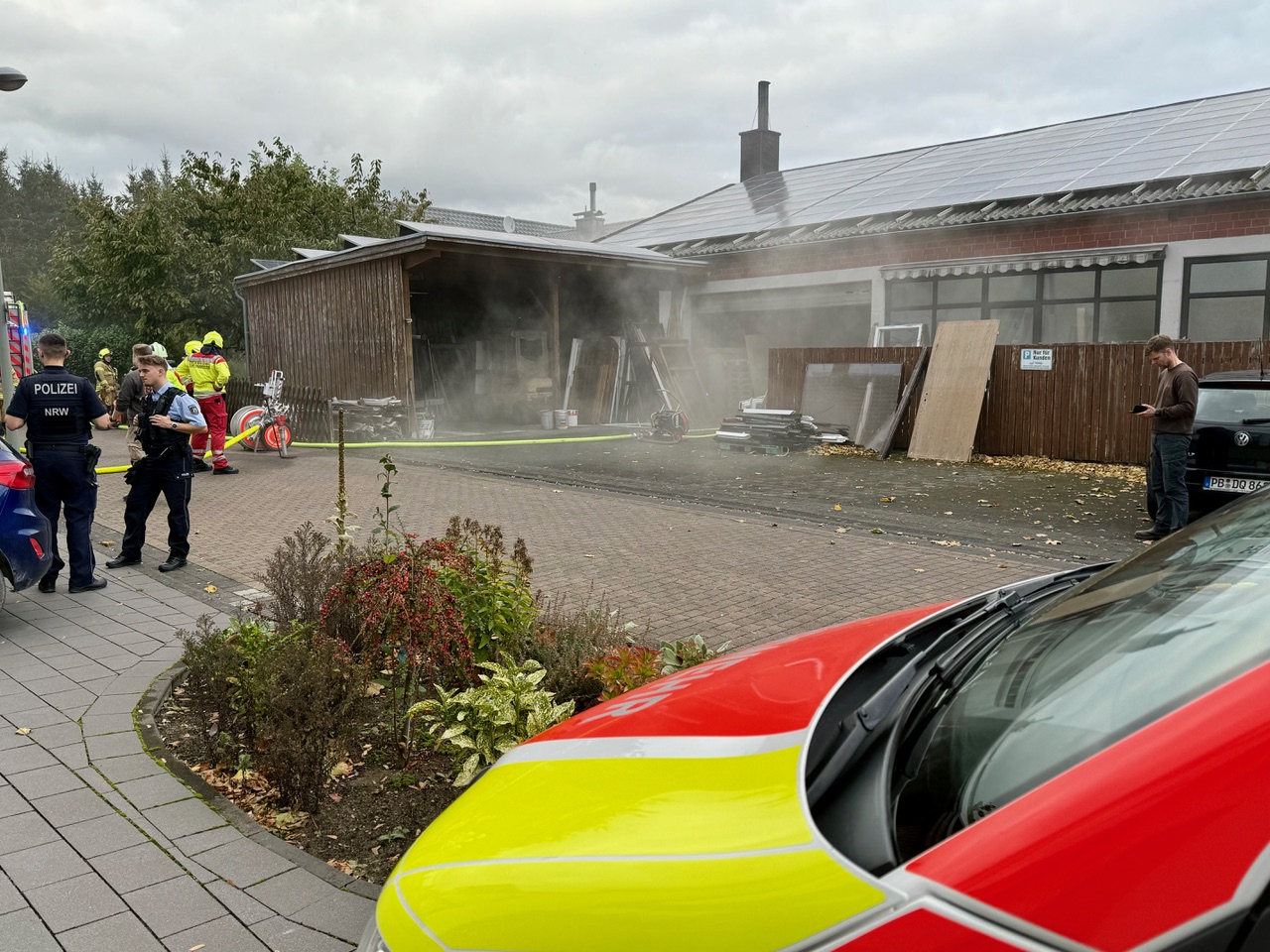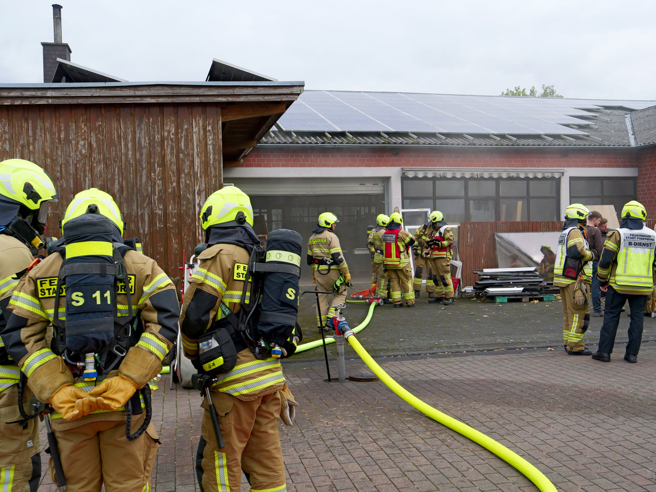 Zu einem Großeinsatz rückte die Feuerwehr Paderborn am Donnerstagnachmittag in den Stadtteil Benhausen aus. In einem Tischlereibetrieb an der Straße Hainhöfen war ein Brand in der Hackschnitzelanlage ausgebrochen. Der rund 30 Kubikmeter fassende Behälter war zu einem guten Teil gefüllt, und beißender Rauch füllte rasch den Werkstattbereich in dem rund 25 mal 30 Meter überbauten Areal.