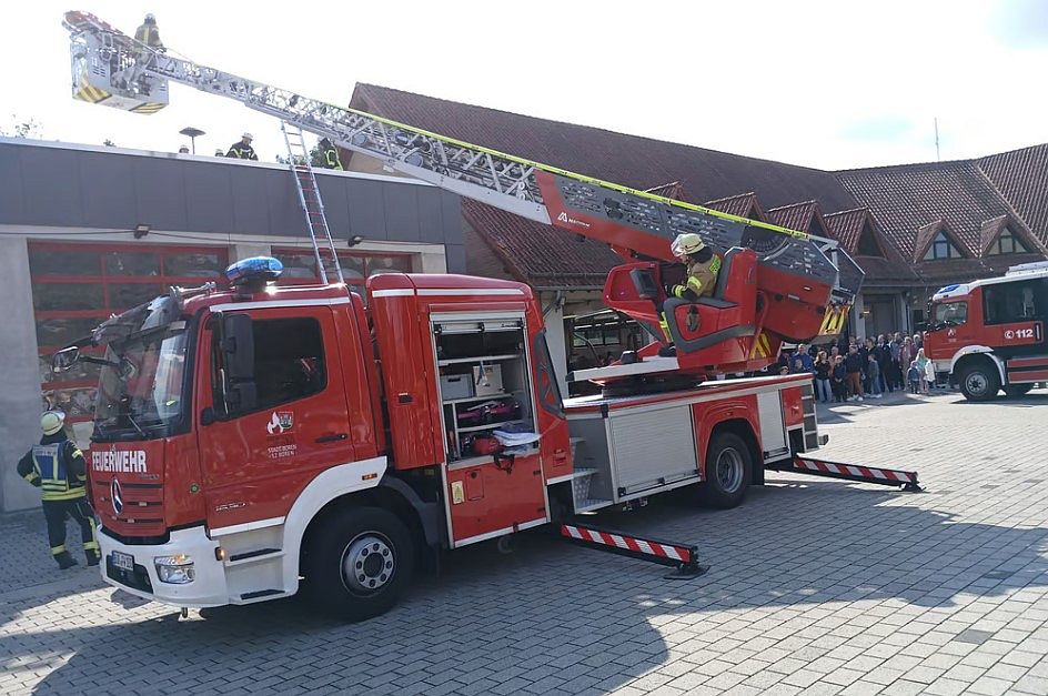 Feuerwehr Büren zeigt neuen Anbau und neue Drehleiter. Neubau schafft Platz für Fahrzeuge und Geräte.