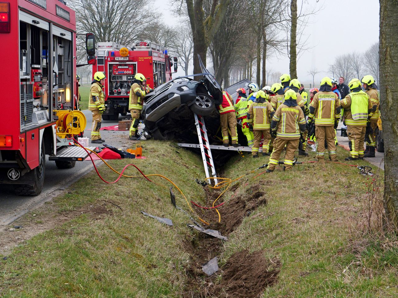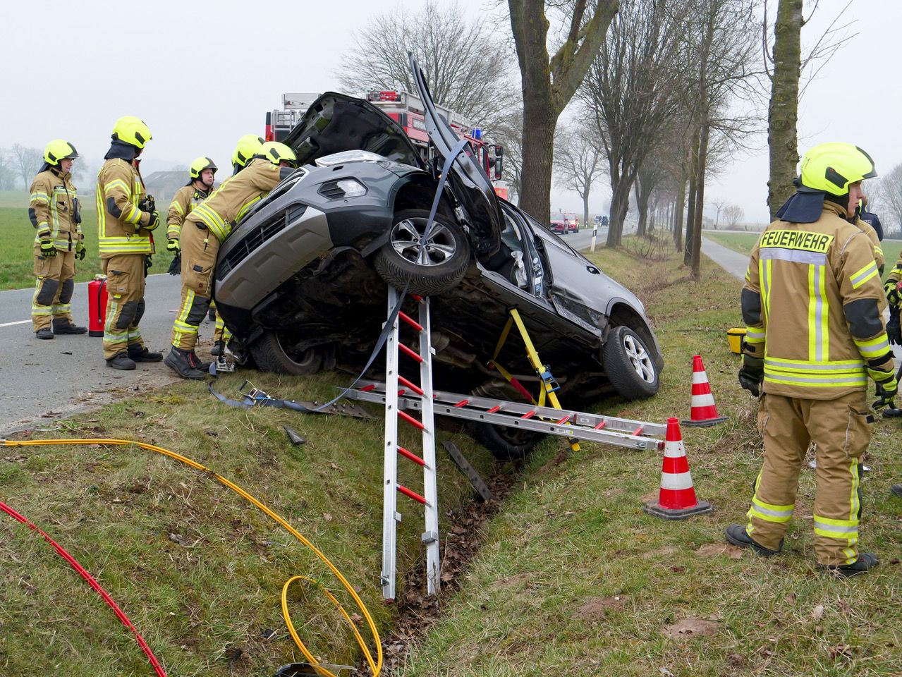 Um 13.08 Uhr alarmierte die Leitstelle des Kreises unter dem Stichwort „Verkehrsunfall, eingeklemmte Person, Pkw im Graben“ die Feuerwehr Bad Lippspringe, die umgehend mit mehreren Großfahrzeugen und 18 Feuerwehrleuten zu Technischen Rettung ausrückte, berichtet Einsatzleiter Jörg Claes, stellvertretender Leiter der Feuerwehr Bad Lippspringe. Außerdem wurden drei Rettungswagen aus Bad Lippspringe und Paderborn sowie der Paderborner Notarzt alarmiert.