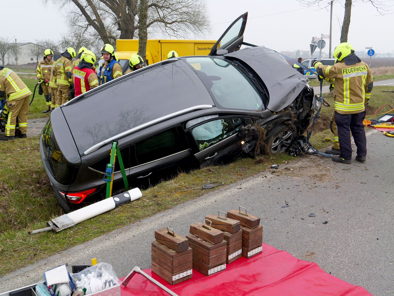 An der Unfallstelle sicherten die Einsatzkräfte das Fahrzeug vor dem Abrutschen und retteten die schwerverletzte Beifahrerin nach Absprache mit dem Rettungsdienstpersonal patientenschonend aus dem Fahrzeug. Dabei wurden auch hydraulische Werkzeuge eingesetzt. Außerdem sicherten die Feuerwehr gemeinsam mit der Feuerwehr die Unfallstelle und kümmerte sich um das Batteriemanagement. Während des Feuerwehreinsatzes und der anschließenden Unfallaufnahme blieb der Kreuzweg im Bereich der Unfallstelle bis in den Nachmittag hineinkomplett gesperrt.
