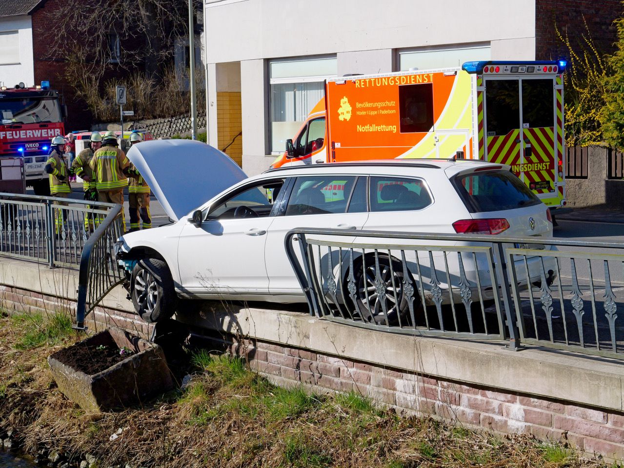 Unter Anleitung des Rettungsdienstes kann der Mann, der kurz nach dem Unfall wieder ansprechbar war, aus eigener Kraft den Wagen verlassen. Nach medizinischer Versorgung wurde der 41-Jährige mit dem Rettungswagen in ein Paderborner Krankenhaus eingeliefert. Der Beifahrer kam mit dem Schrecken davon. Die Feuerwehr sicherte das Fahrzeug ab, kümmerte sich um das Batteriemanagement und streute ausgelaufene Betriebsstoffe ab. Durch das Gefälle floss das Motoröl zum Glück in Richtung Straße, sodass die Beke nicht verschmutzt wurde. Während des Feuerwehreinsatzes blieb die Adenauerstraße für etwa 45 Minuten gesperrt. Bei der Bergung des Wagens kam es später noch kurzzeitig zu weiteren Behinderungen. Die Polizei schätzt den Schaden am Fahrzeug und am Brückengeländer auf rund 25.000 Euro.