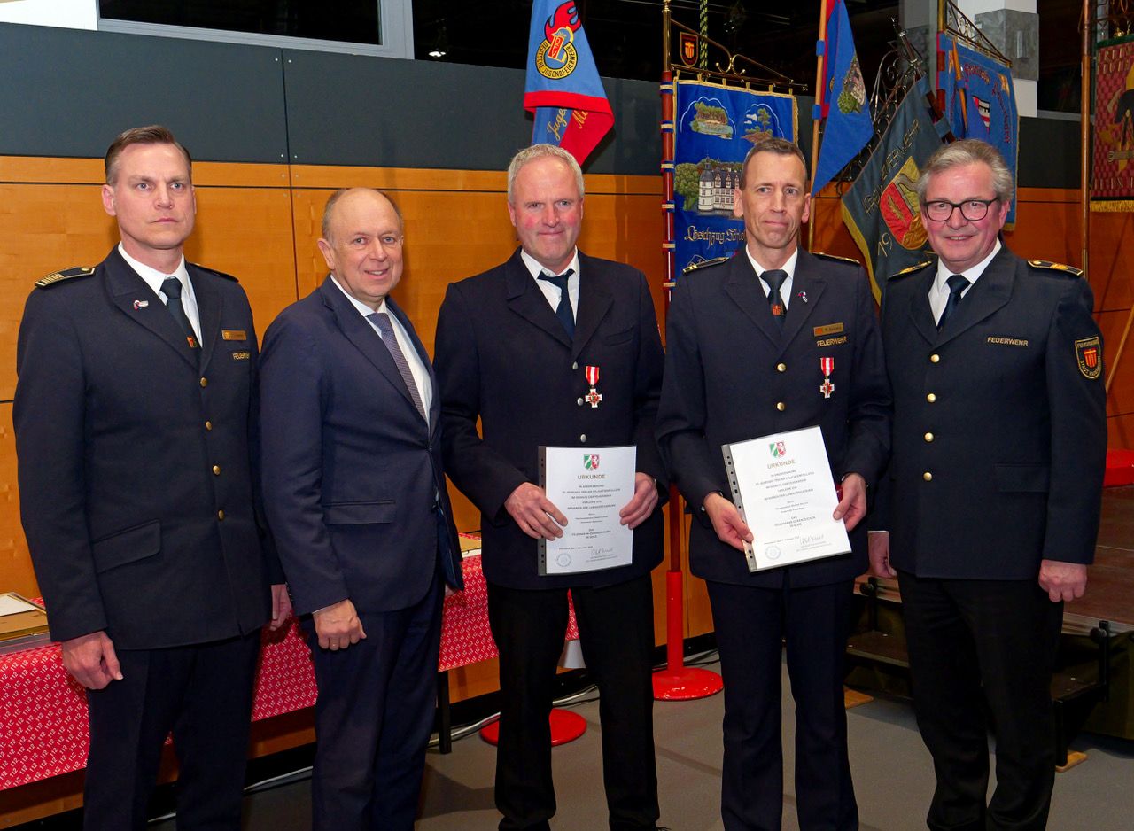 Mit dem Feuerwehrehrenzeichen des Landes in Gold für 35-jährige Mitgliedschaft wurden Detlef Leiwen und Michael Beivers ausgezeichnet.