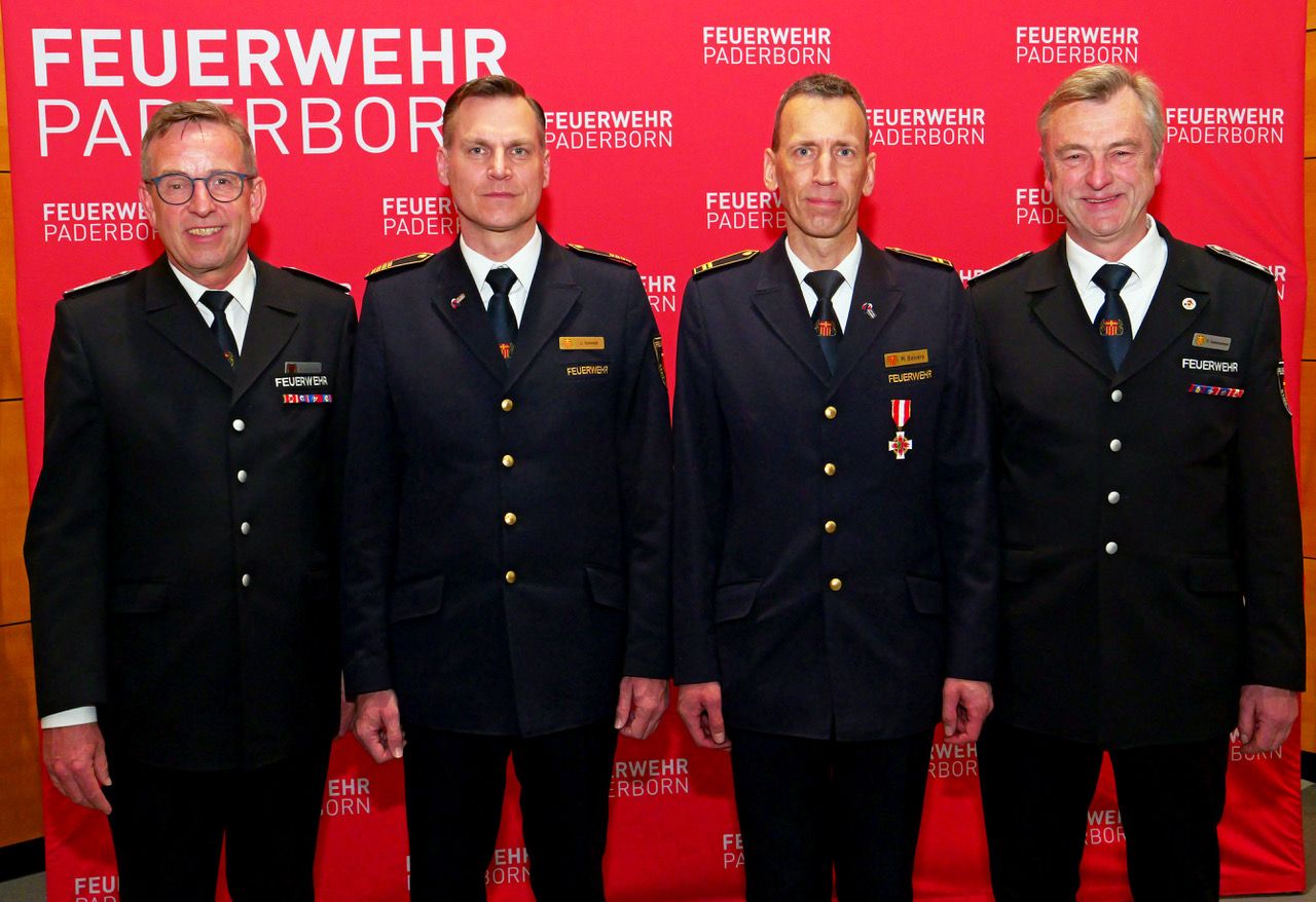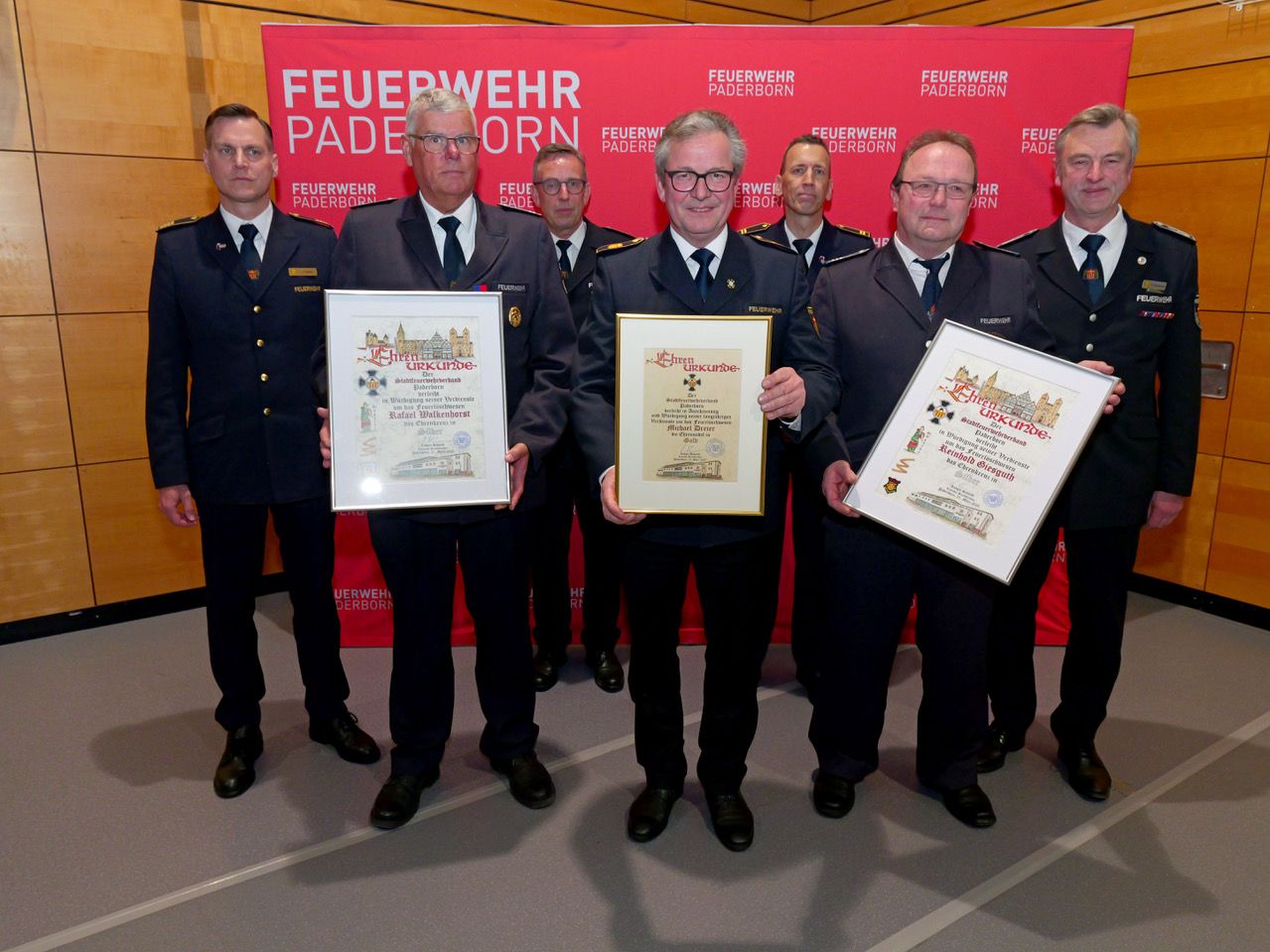 Mit dem Ehrenkreuz in Silber des Stadtfeuerwehrverbandes Paderborn wurden Reinhold Giesguth und Rafael Walkenhorst, beide langjährige Löschzugführer in Schloß Neuhaus, ausgezeichnet. Bürgermeister Michael Dreier wurde mit der Goldenen Ehrennadel des Stadtfeuerwehrverbandes Paderborn geehrt.