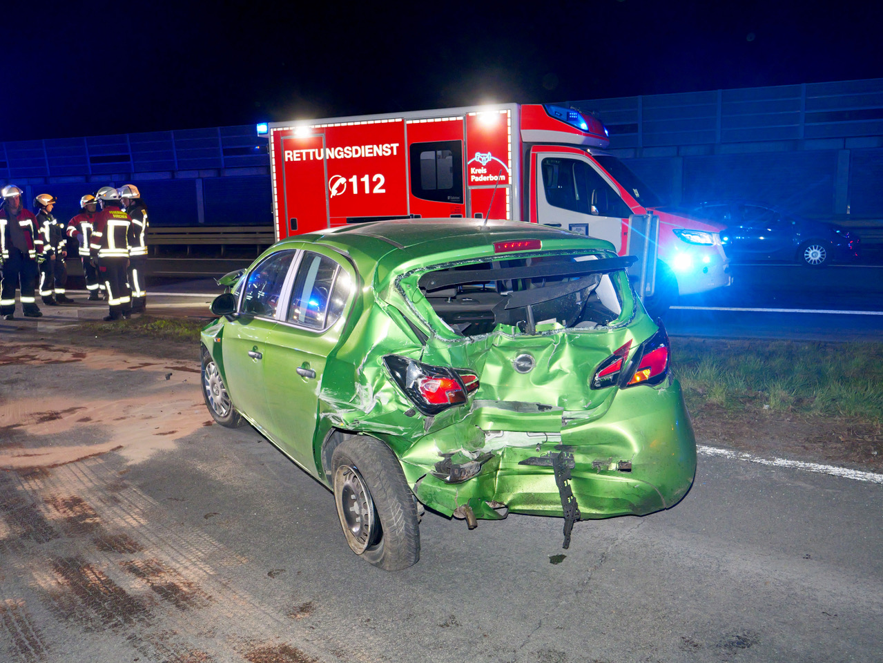 Bis zum Eintreffen aller Rettungsmittel wurden die betroffen Personen erstversorgt und die Einsatzstelle gegen weitere Gefahren abgesichert. Nach notärztlicher Sichtung wurden 9 der 12 Patienten in Krankenhäuser transportiert. Davon waren fünf Personen leicht und drei schwer-, aber glücklicherweise nicht lebensbedrohlich-, verletzt. Eine schwerverletzte Person wurde zur Entlastung der Paderborner Krankenhäuser mit dem Hubschrauber Christoph Westfalen nach Bielefeld geflogen. Drei unverletzte Jugendliche wurden im Einsatzverlauf von der Autobahn zum Gerätehaus Kirchborchen gebracht, um sie dort von der Unterstützungseinheit des Löschzugs Kirchborchen zu betreuen und mit Getränken und Süßigkeiten zu versorgen. Sie wurden gegen 22 Uhr von Angehörigen abgeholt.