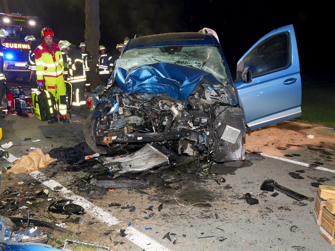 Eine erste Sichtung des 20-jährigen Fahrers und seiner gleichaltrigen Beifahrerin ergab, dass beide massiv im Bein- und Unterkörperbereich eingeklemmt waren. Mit zwei hydraulischen Rettungssätzen arbeiteten die mehr als 40 Feuerwehrleute an der Technischen Rettung der Eingeklemmten und unterstützten den Rettungsdienst. Wegen der Schwere der Verletzungen wurden ebenfalls die Rettungshubschrauber Christoph Westfalen, der auf dem Flughafen Münster/Osnabrück stationiert ist, und Christoph Dortmund alarmiert. Beide Hubschrauber landeten im Abstand weniger Minuten kurz nach 1 Uhr auf einer Wiese östlich der Unfallstelle.