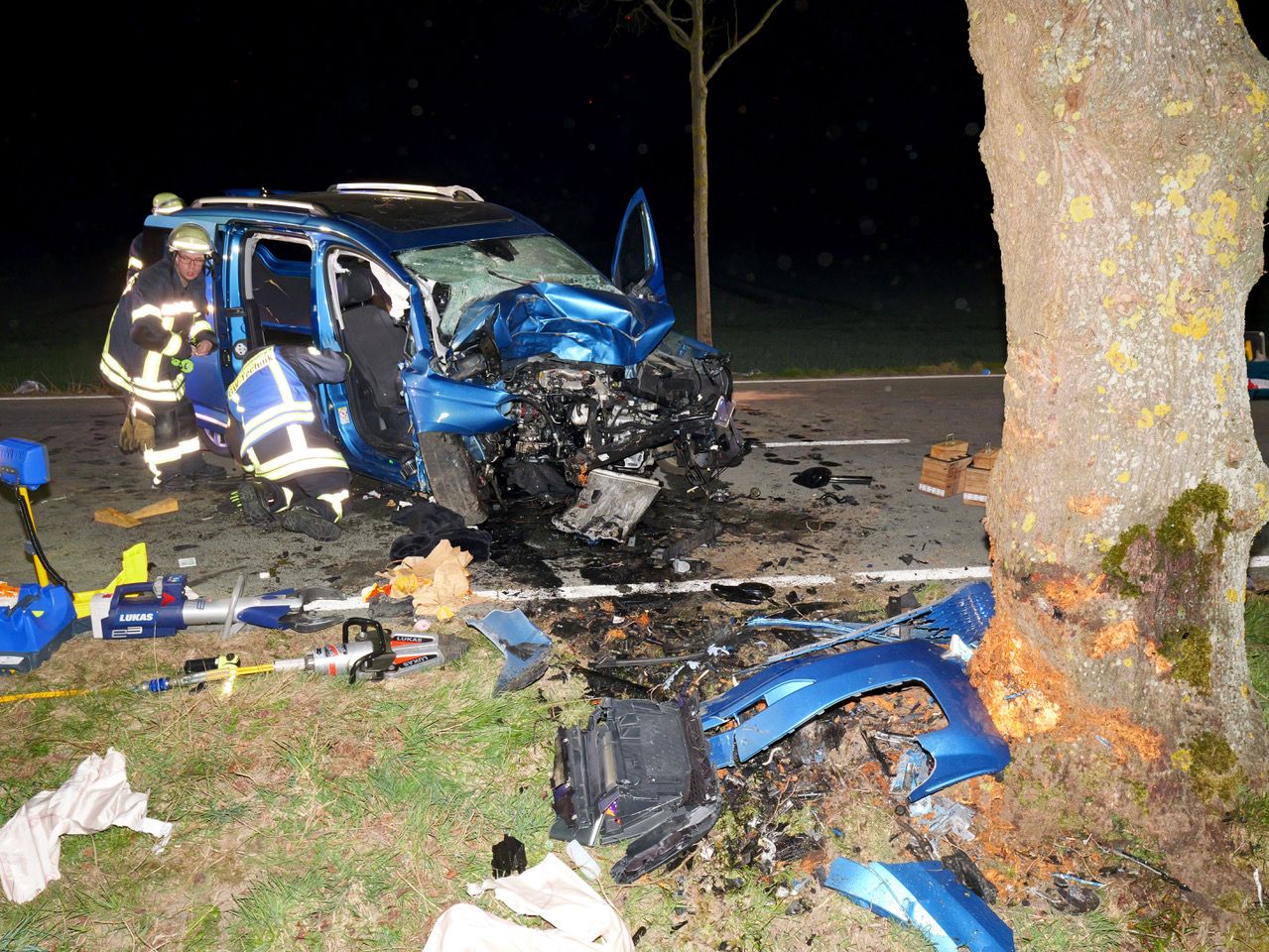 Bei Eintreffen der ersten Einsatzkräfte wurde ein PKW vom Typ VW Caddy vorgefunden, der vor einen Straßenbaum geprallt war. Dabei waren die Fahrzeuginsassen schwer verletzt im Fahrzeugwrack eingeklemmt worden. Die Feuerwehr setzte in Absprache mit dem Rettungsdienst hydraulisches Rettungsgerät ein und befreite beide Personen aus dem Fahrzeug. Die Verletzten wurden notärztlich erstversorgt und mit zwei Rettungshubschraubern in Krankenhäuser nach Dortmund und Kassel transportiert.