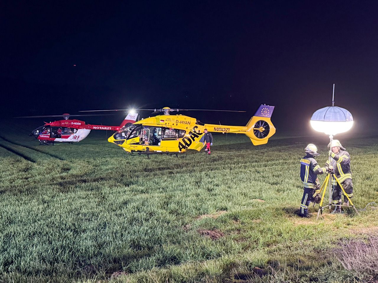 Die Feuerwehr unterstützte den Rettungsdienst, sicherte die Einsatzstelle und leuchtete diese und die Landestellen der Hubschrauber aus, stellte den Brandschutz sicher und nahm auslaufende Betriebsstoffe auf.