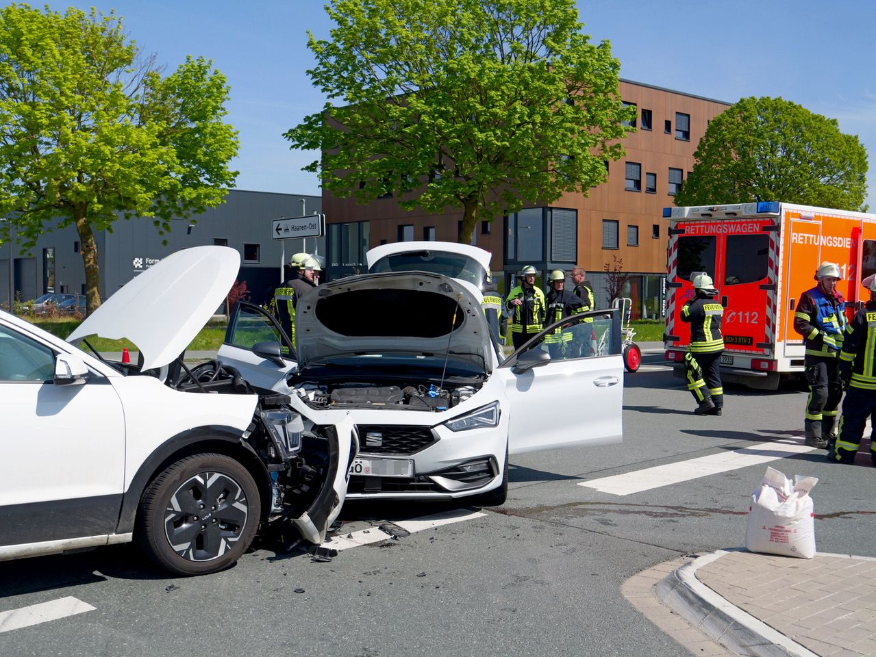 Durch den heftigen Zusammenprall wurden in beiden Fahrzeugen die Airbags ausgelöst, was auch die automatische Notruf-Funktion aktivierte. Um 11.57 Uhr alarmierte die Leitstelle des Kreises unter dem Stichwort „Verkehrsunfall, eingeklemmte Person“ die Feuerwehr Bad Wünnenberg, die umgehend mit rund 18 Kräften der Löschzüge Haaren, Bad Wünnenberg und Fürstenberg sowie der Einheit Helmern ausrückte, berichtet Einsatzleiter Marcus Siekaup, Leiter der Feuerwehr Bad Wünnenberg. Der Rettungsdienst fuhr mit dem Bürener Notarzt und den Rettungswagen aus Borchen und Büren nach Haaren.