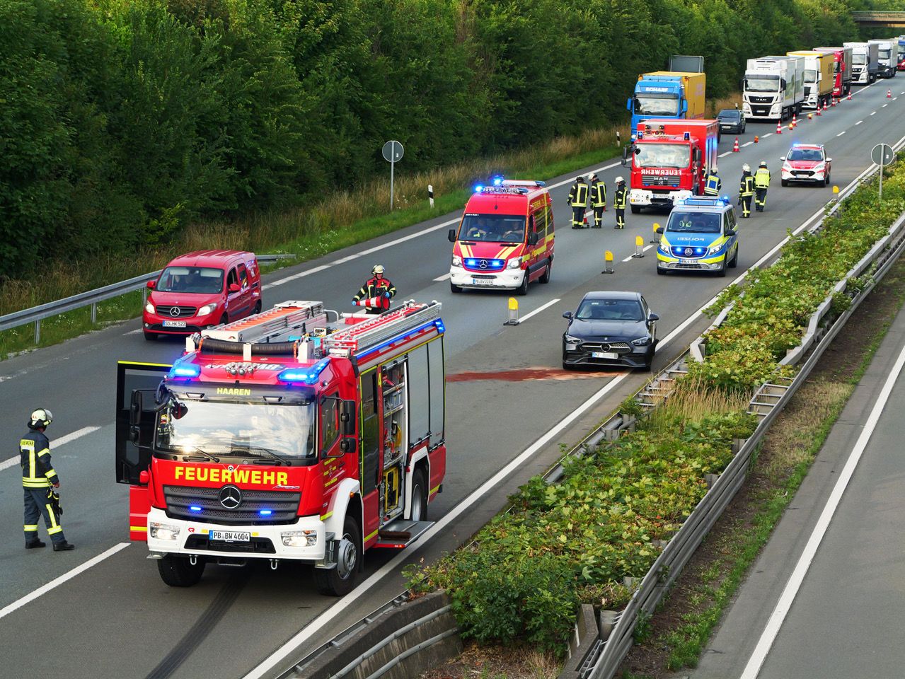 Die Feuerwehr kümmerte sich um die Absicherung der Unfallstelle und das Batteriemanagement. Außerdem streuten die Einsatzkräfte ausgelaufene Betriebsstoffe ab, berichtet Einsatzleiter Marcus Siekaup, Leiter der Feuerwehr Bad Wünnenberg. Während des Feuerwehreinsatzes wurde der Verkehr einspurig an der Unfallstelle vorbeigeführt. In Fahrtrichtung Dortmund kam es zu einem Rückstau von einigen Hundert Metern.